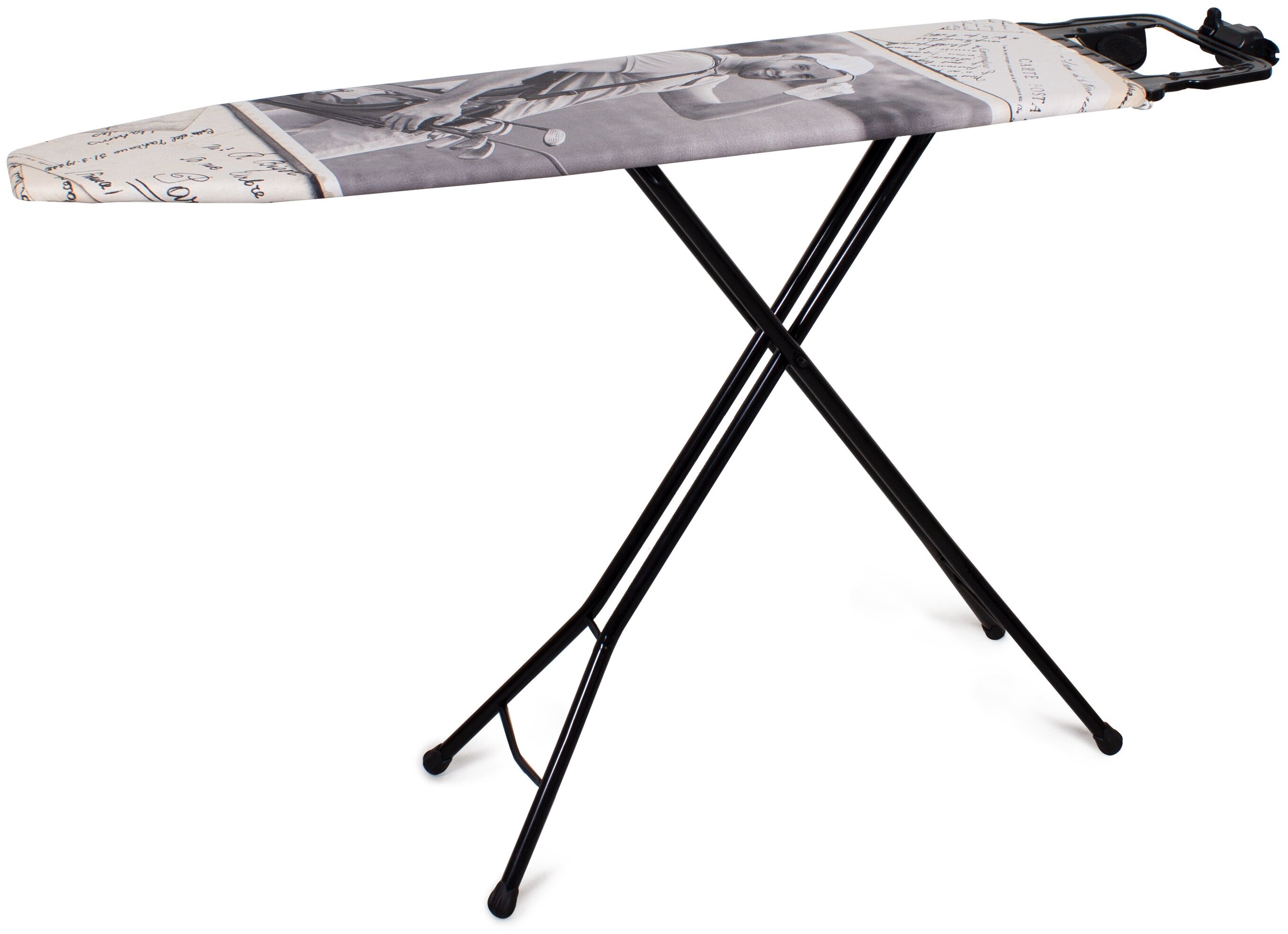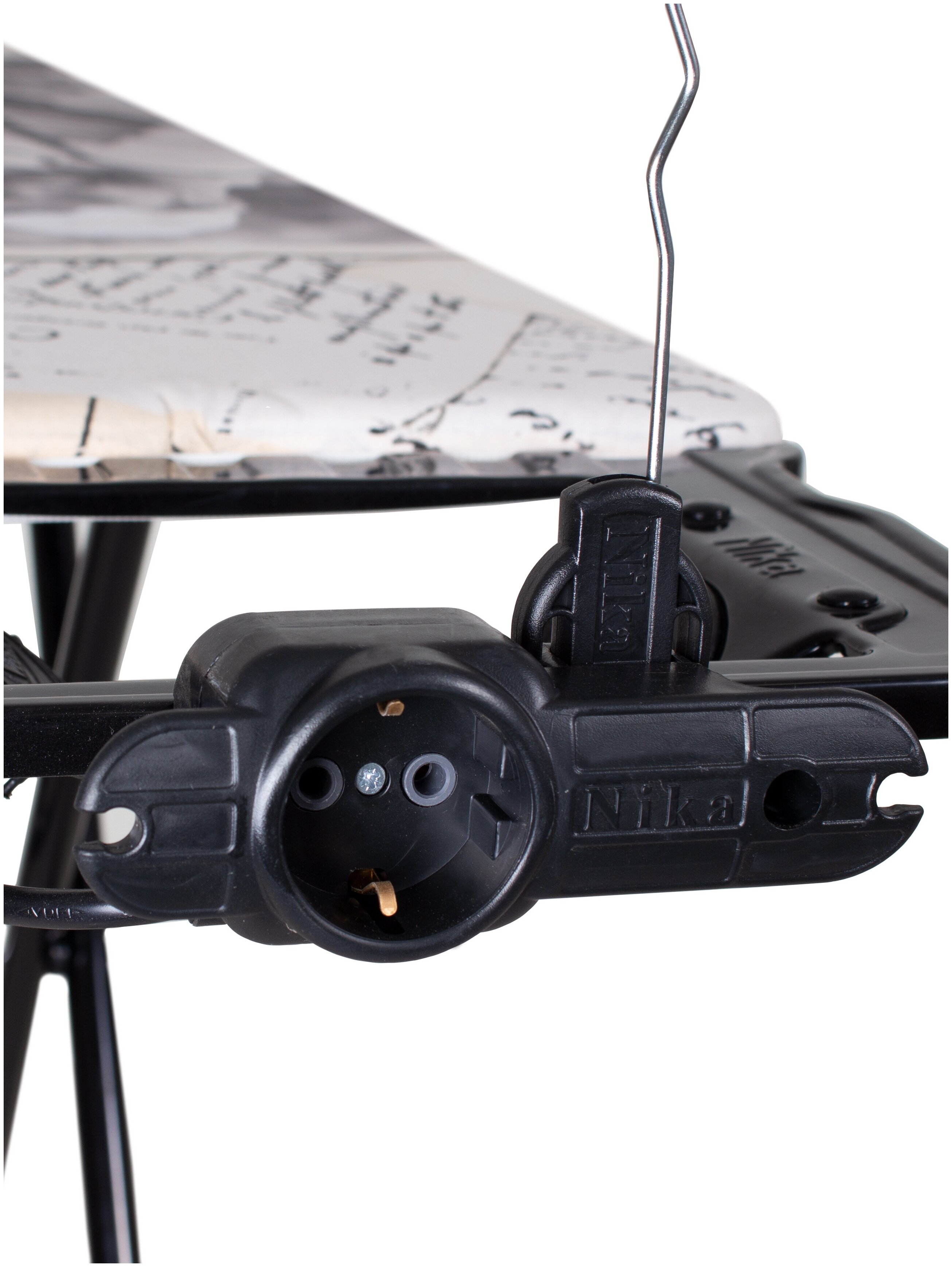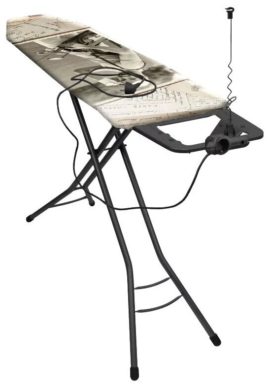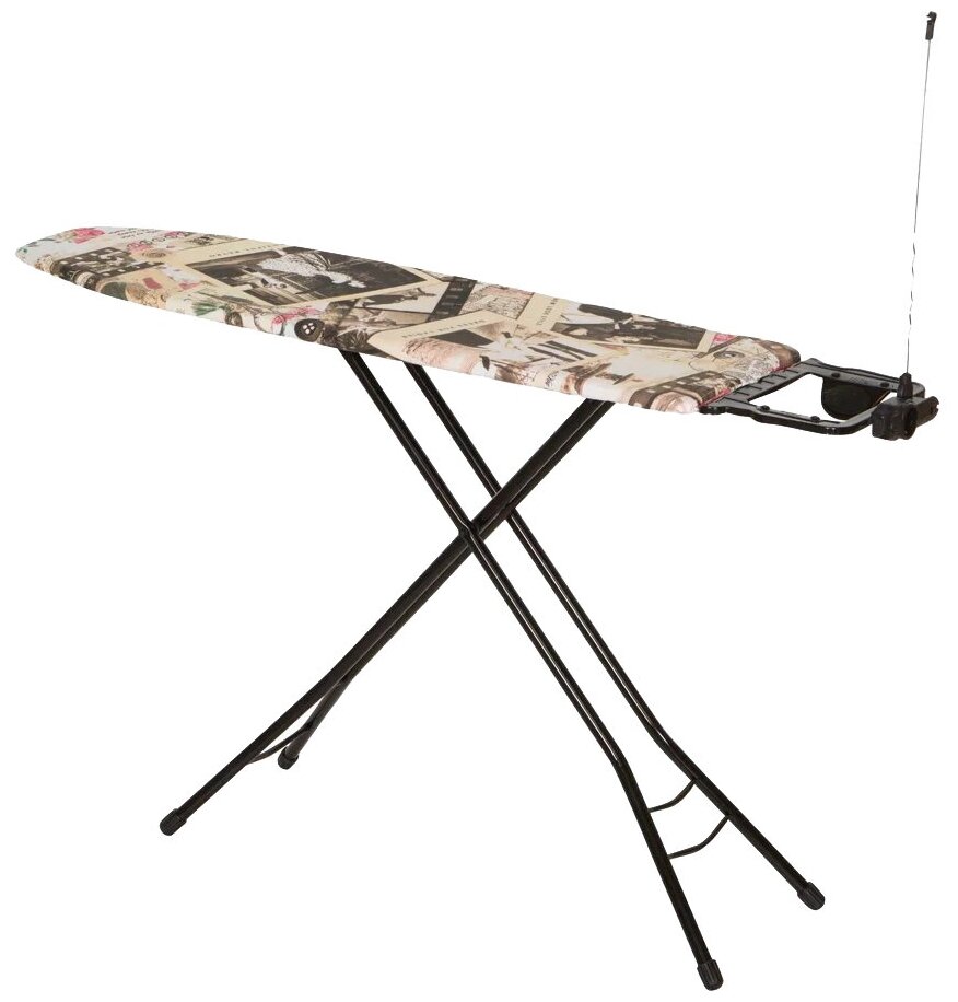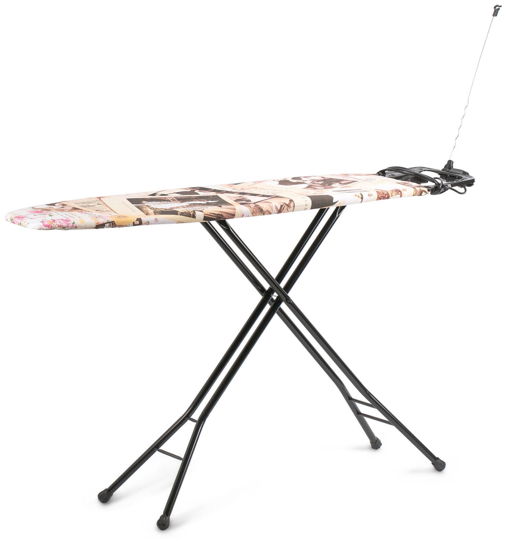 комплектация: подставка для утюга, встроенная розетка для утюга, кронштейн для провода, удлинитель, материал столешницы: металл, тип столешницы: с перфорацией, материал каркаса: металл, длина гладильной поверхности: 122 см, ширина гладильной поверхности: 34 см, особенности: регулировка высоты, съемный чехол, противоскользящие насадки