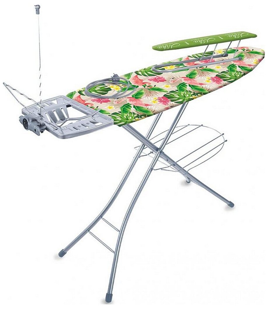комплектация: подставка для утюга, гладильный рукав, встроенная розетка для утюга, полка для белья, кронштейн для провода, материал столешницы: металл, тип столешницы: с перфорацией, материал каркаса: металл, длина гладильной поверхности: 122 см, ширина гладильной поверхности: 40 см, особенности: регулировка высоты, съемный чехол, противоскользящие насадки, вешалка для рубашек