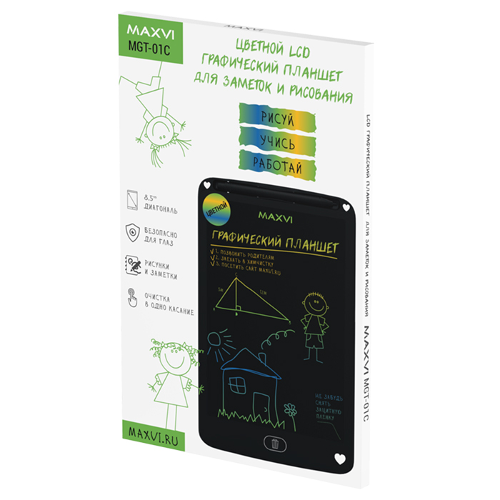 Графический планшет MGT-01С – это простое устройство, на котором удобно делать различные заметки, наброски, рисунки точно также, как на обычном листе бумаги при помощи ручки или карандаша. : Отличительной особенностью модели является цветной (трехцветный) дисплей, который позволит придать более интересный вид вашим шедеврам. Дисплей планшета высокочувствителен к нажиму, а именно, при изменении силы нажатия можно рисовать линии различной толщины. : При попадании яркого света на дисплей, рисунки (надписи) становятся более отчетливыми. Дисплей планшета не имеет подсветки и безопасен для вашего зрения. Планшет и стилус изготовлены из прочного и нетоксичного пластика. Устройство подходит для любых возрастов.: МАТЕРИАЛ КОРПУСА ABS пластик: МОДЕЛЬ MGT-01C: ТИП УСТРОЙСТВА Планшет для рисования: ДИСПЛЕЙ: КОЛИЧЕСТВО ЦВЕТОВ 3: РАЗМЕР 8.5”: ТИП LCD, цветной: УГОЛ ОБЗОРА 160°: ХАРАКТЕРИСТИКИ АККУМУЛЯТОРА: Тип аккумулятора Съемная батарея CR2016: ДОПОЛНИТЕЛЬНЫЕ ХАРАКТЕРИСТИКИ: ВЕС 98.5 г: ГАБАРИТЫ УСТРОЙСТВА 225 x 145 x 6