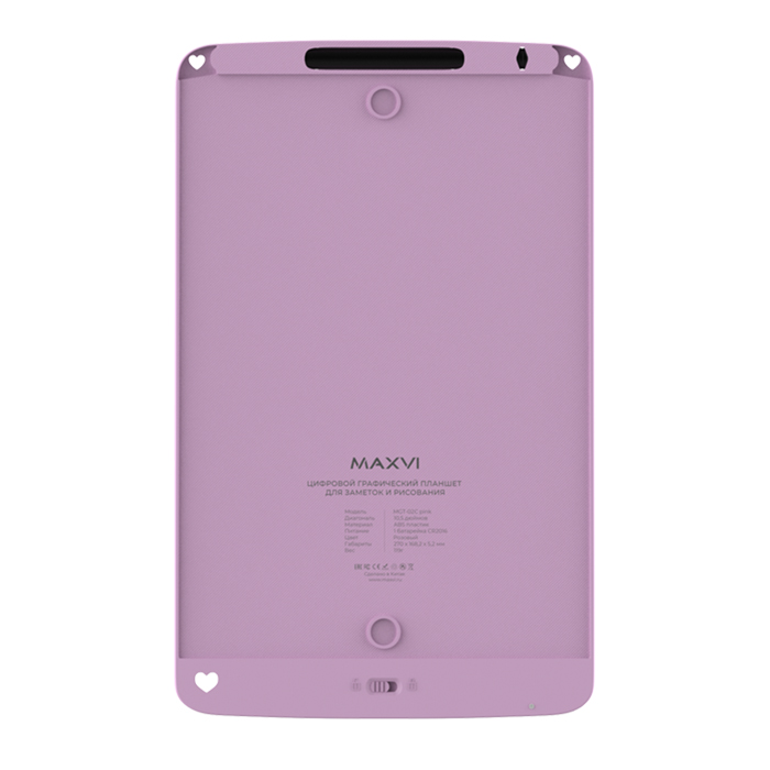 Графический планшет MGT-02С – это простое устройство, на котором удобно делать различные заметки, наброски, рисунки точно также, как на обычном листе бумаги при помощи ручки или карандаша. : Отличительной особенностью модели является цветной (трехцветный) дисплей, который позволит придать более интересный вид вашим шедеврам. Дисплей планшета высокочувствителен к нажиму, а именно, при изменении силы нажатия можно рисовать линии различной толщины. : При попадании яркого света на дисплей, рисунки (надписи) становятся более отчетливыми. Дисплей планшета не имеет подсветки и безопасен для вашего зрения. Планшет и стилус изготовлены из прочного и нетоксичного пластика. Устройство подходит для любых возрастов. : ОСНОВНЫЕ ХАРАКТЕРИСТИКИ: МАТЕРИАЛ КОРПУСА ABS пластик: МОДЕЛЬ MGT-02C: ТИП УСТРОЙСТВА Планшет для рисования: ДИСПЛЕЙ: КОЛИЧЕСТВО ЦВЕТОВ 3: РАЗМЕР 10.5”: ТИП LCD, цветной: УГОЛ ОБЗОРА 160°: ХАРАКТЕРИСТИКИ АККУМУЛЯТОРА: Тип аккумулятора Съемная батарея CR2016: ДОПОЛНИТЕЛЬНЫЕ ХАРАКТЕРИСТИКИ: ВЕС 138 г: ГАБАРИТЫ