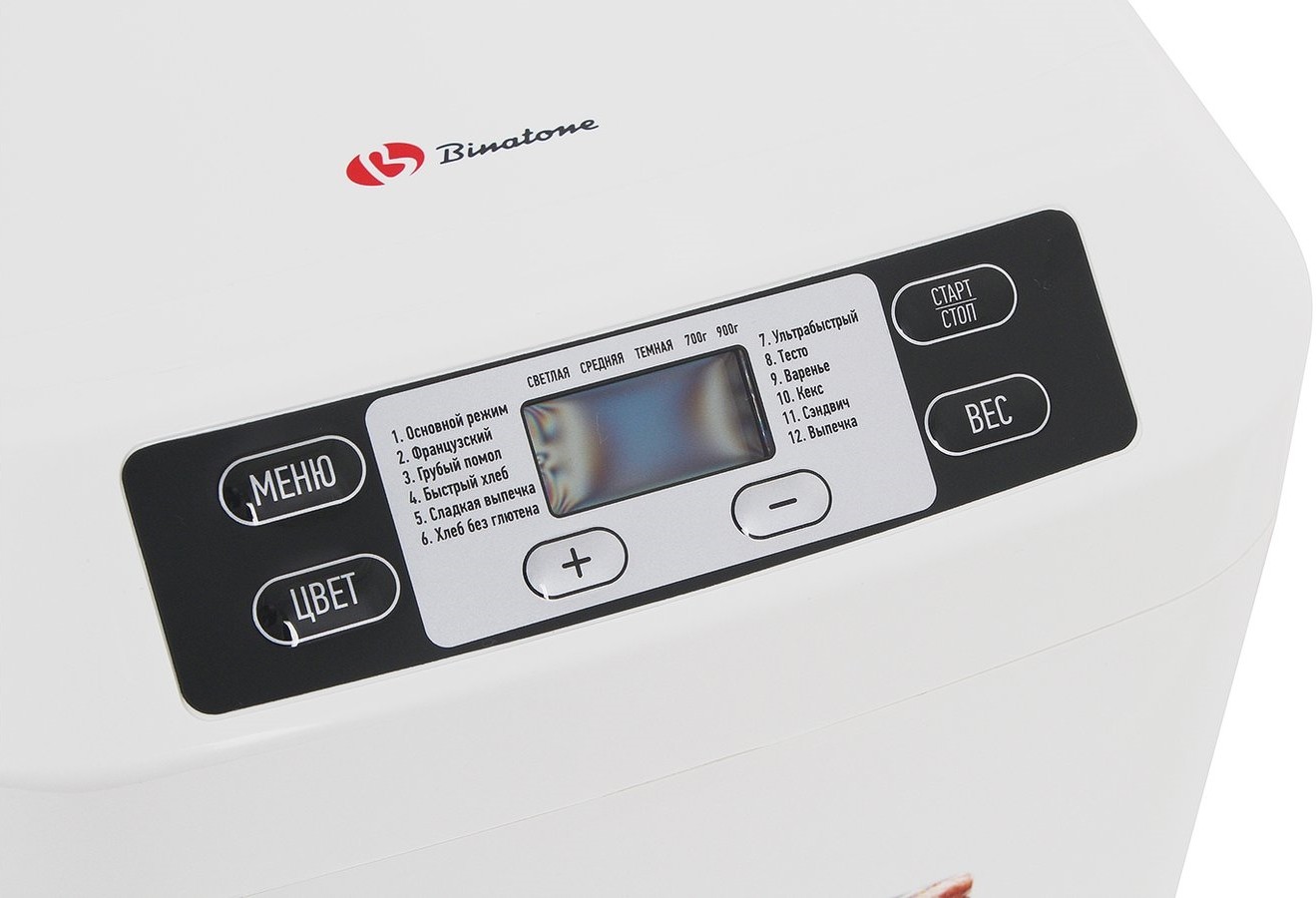 вес выпечки 900 г; варенье, сладкая выпечка, безглютеновая выпечка, кекс, французский багет, хлеб из муки грубого помола; выбор цвета корочки, таймер, замес теста, ускоренная выпечка; выпечка в форме буханки; 12 автоматических программ