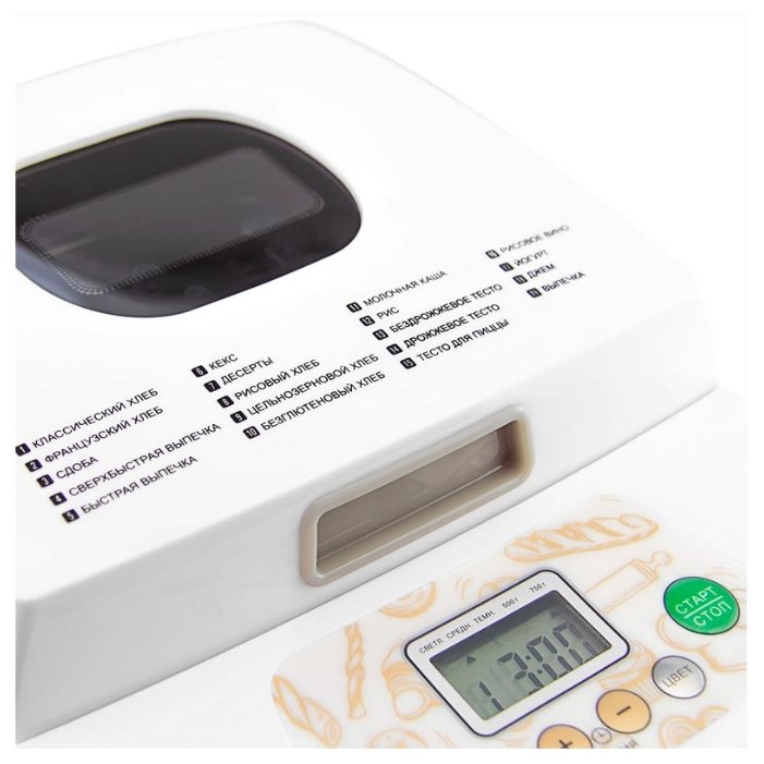 - Специальные программы: бездрожжевая выпечка, варенье, безглютеновая выпечка, кекс, французский багет, пшеничный хлеб, хлеб