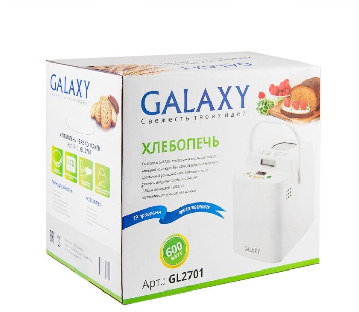 вес выпечки 750 г; бездрожжевая выпечка, варенье, безглютеновая выпечка, кекс, французский багет, пшеничный хлеб, хлеб из муки грубого помола; выбор цвета корочки, таймер, регулировка веса выпечки, замес теста, ускоренная выпечка; выпечка в форме буханки; 19 автоматических программ