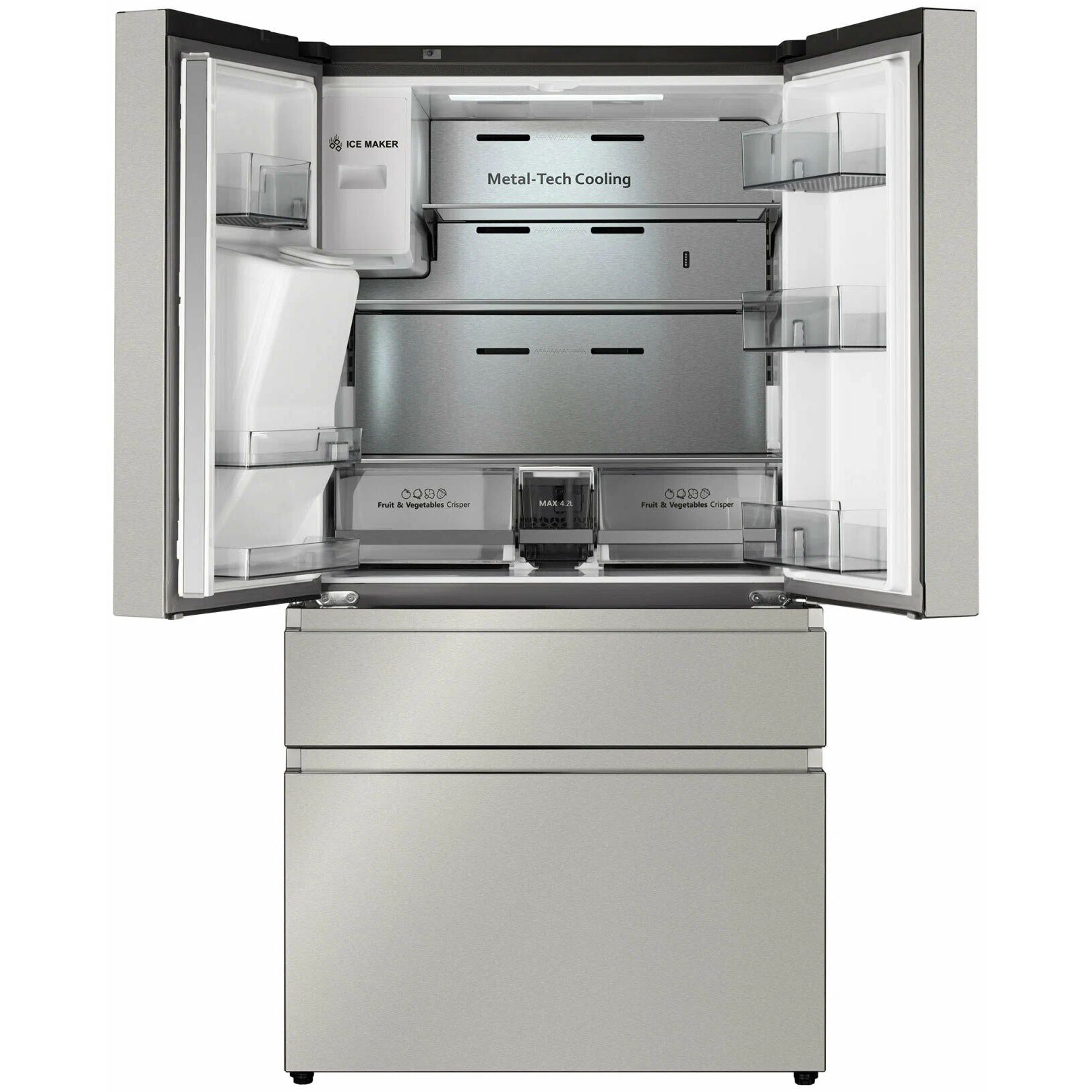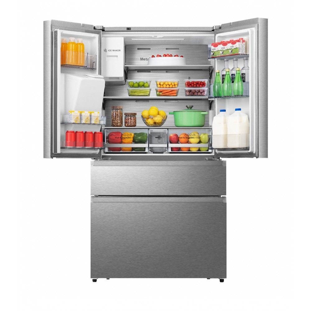 Габариты и вес: Общий объем, л: 560: Размеры, мм (ШхГхВ): 912х725х1780: Общий объем холодильной камеры, л: 329: Общий объем морозильной камеры, л: 151: Ширина, см: 91.2: Глубина, см: 72.5: Высота, см: 178.5: Вес, кг: 141: Корпус: Открывание дверей: В стороны: Количество дверей: 4: Количество полок: 3: Количество полок на двери: 6: Материал полок: Стекло: Расположение морозильной камеры: Снизу: Количество камер: 2: Конструкция холодильника: ЖК дисплей, Светодиодная подсветка, Скрытые ручки: Общие: Тип: Холодильник: Страна-изготовитель: Китай: Энергопотребление: Класс энергопотребления: A+: Годовое потребление, кВт ч/год: 344: Климатический класс: ST +18°C / +38°C: Основные: Размораживание: No frost: Расположение: Отдельностоящий: Зона свежести: Да: Тип управления: Сенсорное: Тип охлаждения: Компрессорный: Вид холодильника: С морозильной камерой: Функционал холодильника: Авторазморозка, Суперзаморозка, Суперохлаждение, Генератор льда: Заводские данные: Мощность замораживания (кг/сут): 12.8: Вид компрессора: Инв