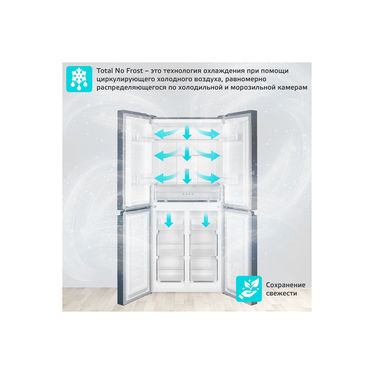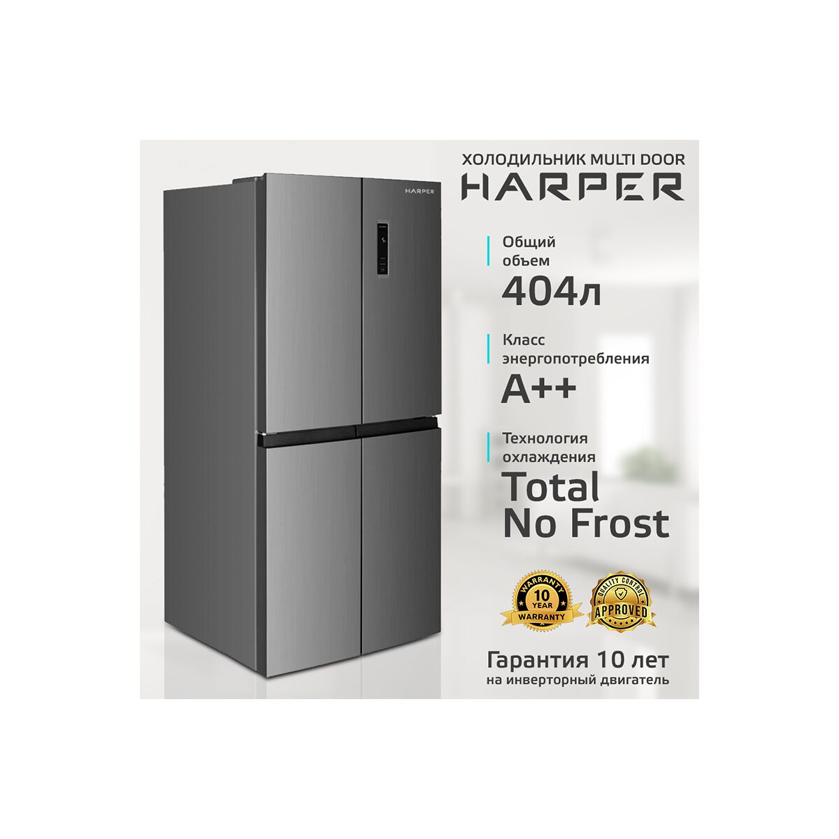 Общие характеристики: Класс энергопотребления: А++: Энергопотребление в год: 267 кВтч: Общий объем: 404 л.: Полезный объем: 362 л.: Количество камер: 3: Количество дверей: 4: Объем холодильного отделения: 237 л.: Объем морозильного отделения: 125 л.: Минимальная температура: -18° С: Уровень шума: 39 дБ: Тип управления: LED touch screen: Подсветка: LED: Разморозка: Total No Frost: Хладогент: R600A: Масса хладогента: 66 гр.: Особенности: Тип компрессора: Inverter: Количество компрессоров: 1: Климатический класс: SN~T: Мощность замораживания: 10 кг/сутки: Хранение при откл. питания: 10 ч.: Зона сохранения свежести (да/нет): да: Ящиков в зоне сохр. свежести: 1: Система контроля: Door display: Панель дисплея и управления: LED touch screen: Функция быстрого охлаждения: да: Функция быстрого замораживания: да: Режим "Отпуск": да: Функция закрытия холодильника: да: Сигнал "Открытой двери": да: Замок от детей: да: Количество полок: 2: Ящик для овощей: 1: Лоток для яиц: 2: Лоток для льда: 1: Физические параметры: Цвет: