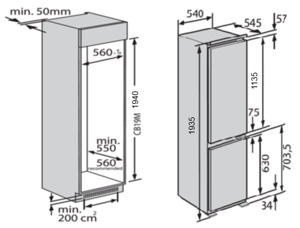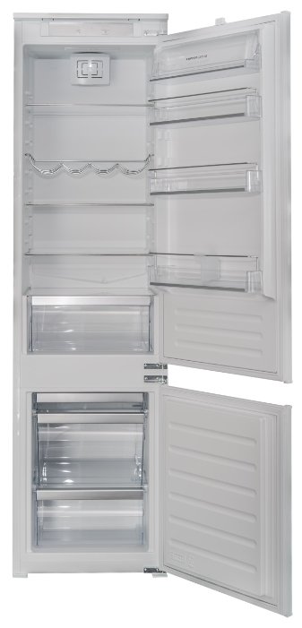 Встраиваемый двухкамерный холодильник, Габариты(ВхШхГ):193x54x54,5; Перенавешиваемые двери; Крепление - скользящие направляющие; Антибактериальный пластик; Светодиодное освещение; Система автоматического размораживания холодильной камеры; Система динамического охлаждения; Электронно-механическое управление; Полезный объем хол. камеры: 228 л; Полезный объем мороз. камеры: 80 л; Класс энергопотребления А; дневное потребление электроэнергии: 0,86 кВт*ч; Уровень шума: 35дБ. (ИТАЛИЯ)