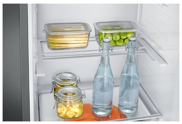 Скрытые ручки, довольно много места в холодильнике и в морозильной камере.