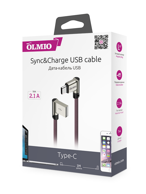 Кабель OLMIO 038769 USB 2.0 - USB type-C 1м угловой Коричневый