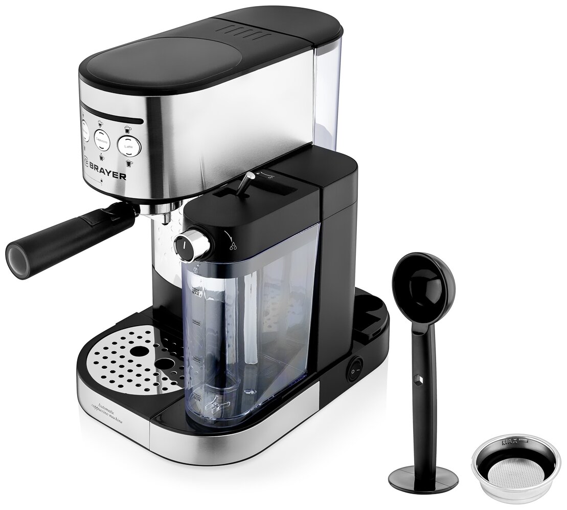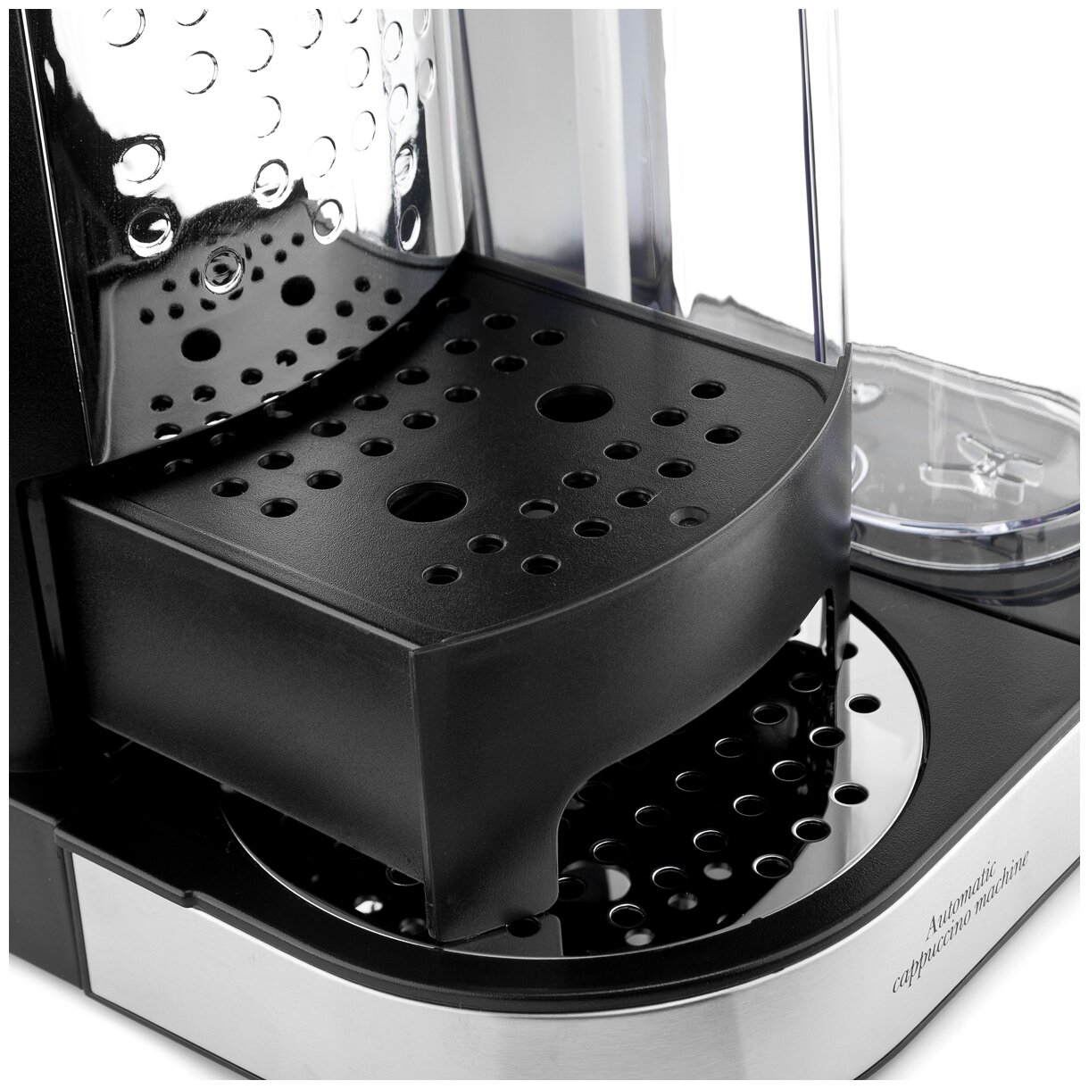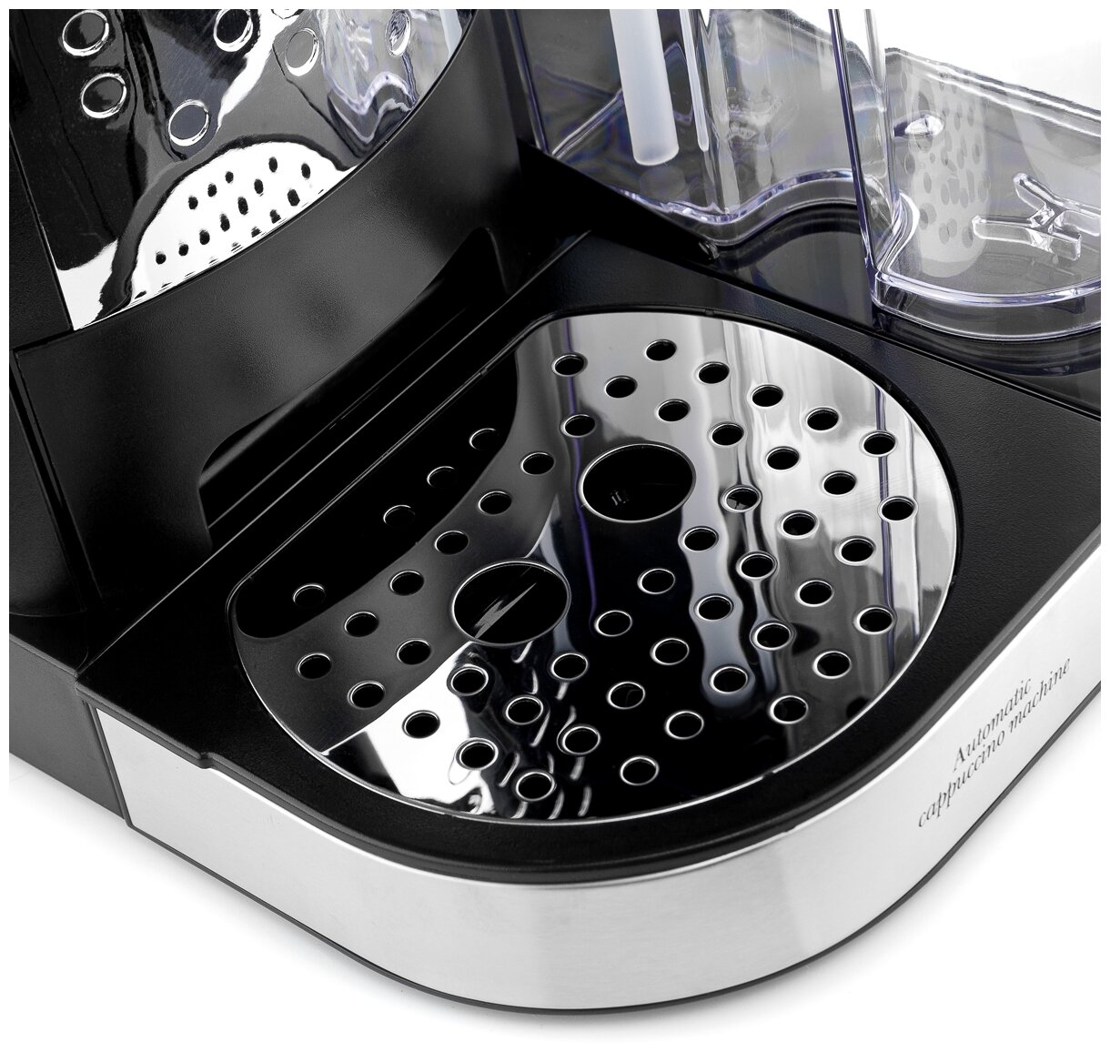 тип устройства: кофеварка, тип: рожковая, тип используемого кофе: молотый, приготовление капучино: автоматическое, тип напитка: латте, капучино, эспрессо, давление помпы: 15 бар, одновременное приготовление двух чашек, объем: 1.20 л, особенности конструкции: съемный лоток для сбора капель, индикатор включения
