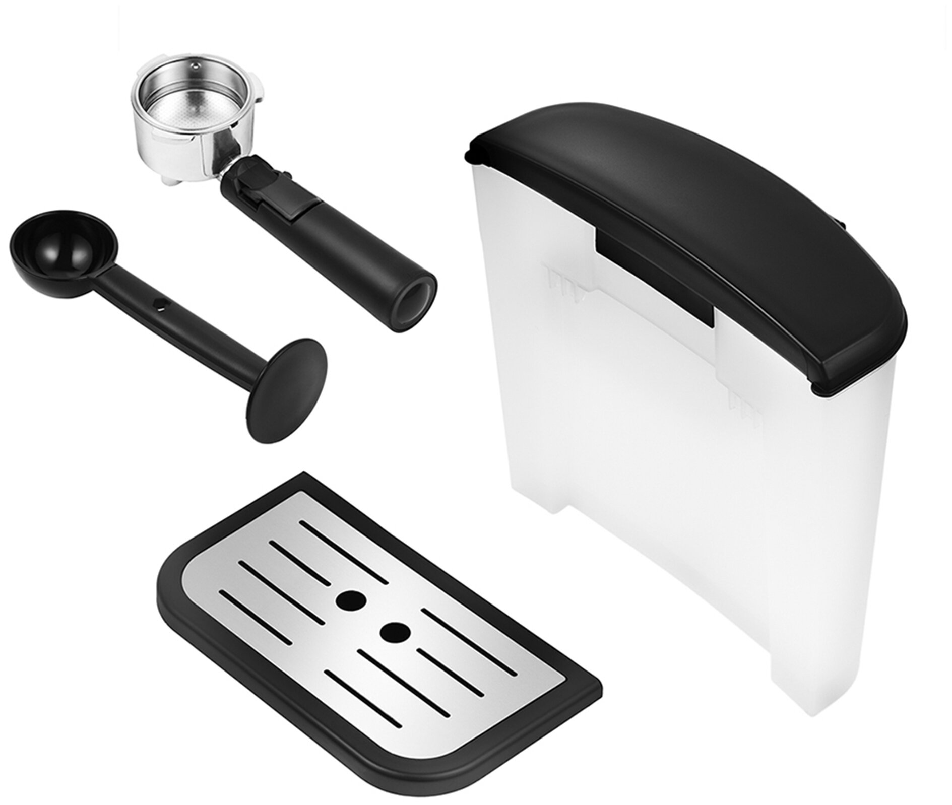 тип устройства: кофеварка, тип: рожковая, тип используемого кофе: молотый, приготовление капучино: ручное, тип напитка: латте, капучино, эспрессо, давление помпы: 15 бар, одновременное приготовление двух чашек, объем: 1.50 л, дополнительные функции: подогрев чашек, быстрый пар, подача горячей воды, особенности конструкции: подсветка, съемный лоток для сбора капель, индикатор уровня воды, индикатор включения