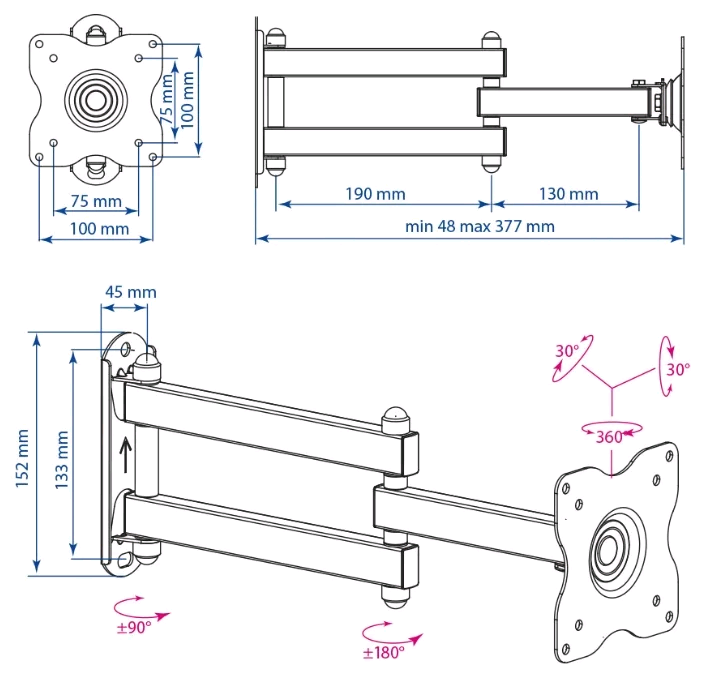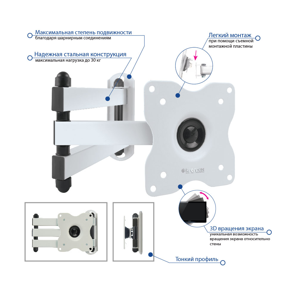 назначение: ЖК-телевизор; максимальная нагрузка 30 кг; диагональ ТВ 15" - 28"; способ регулировки: наклон, поворот