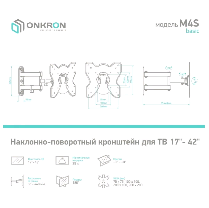назначение: ЖК-телевизор; максимальная нагрузка 35 кг; диагональ ТВ 17" - 42"; способ регулировки: наклон, поворот
