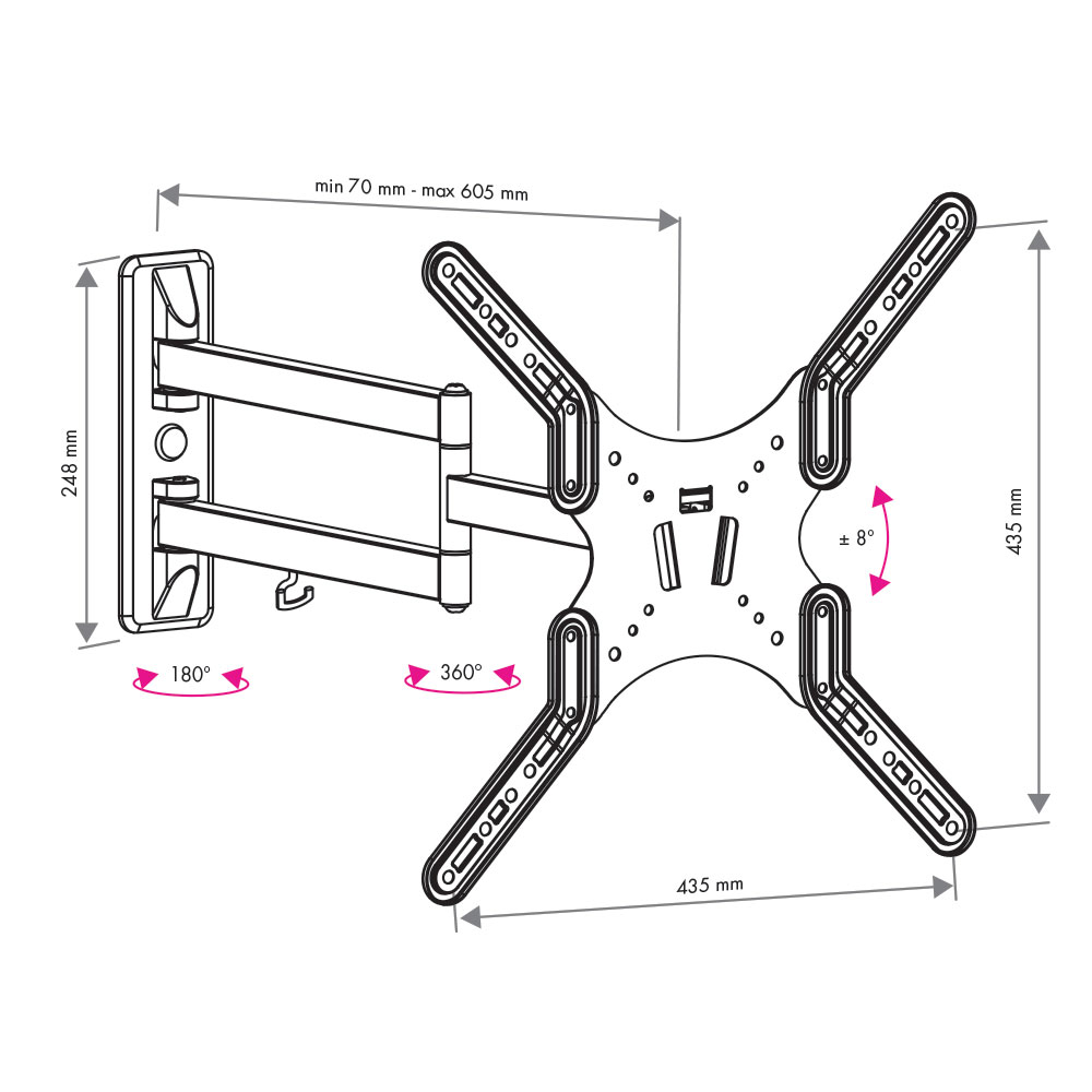 назначение: ЖК-телевизор; максимальная нагрузка 30 кг; диагональ ТВ 20" - 55"; способ регулировки: наклон, поворот
