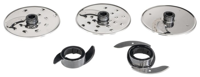 - Насадки: универсальный нож, насадка для теста, диск для картофеля-фри, терка, насадка для нарезки ломтиками,