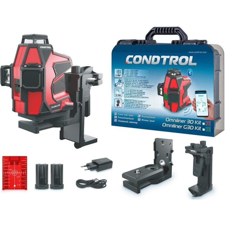 Тип прибора; Лазерный нивелир; Описание; CONDTROL Omniliner 3D Kit профессиональный расширенный комплект, включающий в себя лазерный нивелир Omniliner 3D, настенное крепление, крепление-зажим, магнитную мишень, аккумулятор - 2 шт., кабель для зарядки, руководство по эксплуатации и надежный, водонепроницаемый пластиковый кейс.; Лазерный диод; 635 нм; Класс лазера; 2; Цвет луча; красный; Диапазон измерения; 40 - 80 м; Точность измерения нивелира; +0,2 / -0,2 мм/м; Диапазон автоматического нивелирования; ±4 °; Функция «вертикальная линия»; есть; Функция «горизонтальная линия»; есть; Функция «горизонтальная линия 360 градусов»; есть; Возможность крепления к штативу; 1/4", 5/8"; Класс защиты; IP65; Кол-во элементов питания; 2; Тип элементов питания; Li-ion аккумулятор; Продолжительность работы; 10 ч; Размеры (ШxВxГ); 138 x 110 x 140 мм; Вес; 835 грамм; Габариты упаковки (ед) ДхШхВ; 0.33x0.15x0.28 м