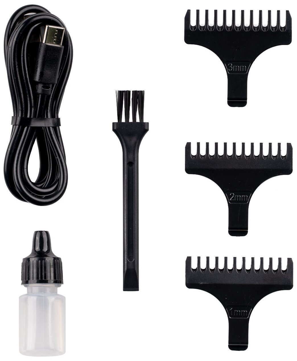 тип: машинка для стрижки, питание: автономное/от сети, тип элементов питания: собственный аккумулятор, материал лезвий: нержавеющая сталь, особенности: индикатор зарядки, в комплекте: кабель USB, кабель для зарядки, щеточка, масло, расческа, число насадок: 3, время автономной работы: 120 мин