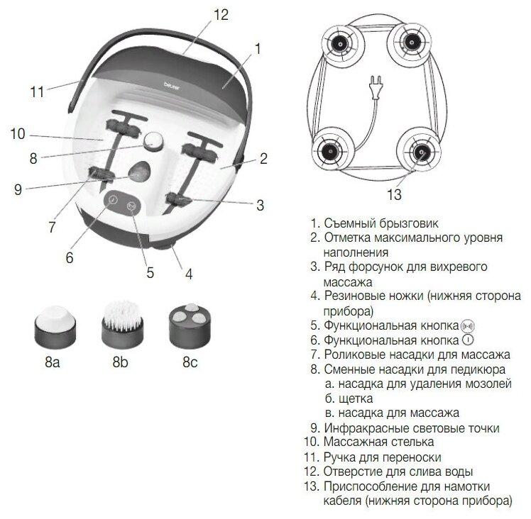 вид массажа: вибрационный, пузырьковый, количество режимов: 2 шт., особенности конструкции: массажные ролики, защитная крышка, функции: эффект водоворота, поддержание температуры воды, инфракрасный излучатель, работает от сети, мощность: 60 Вт