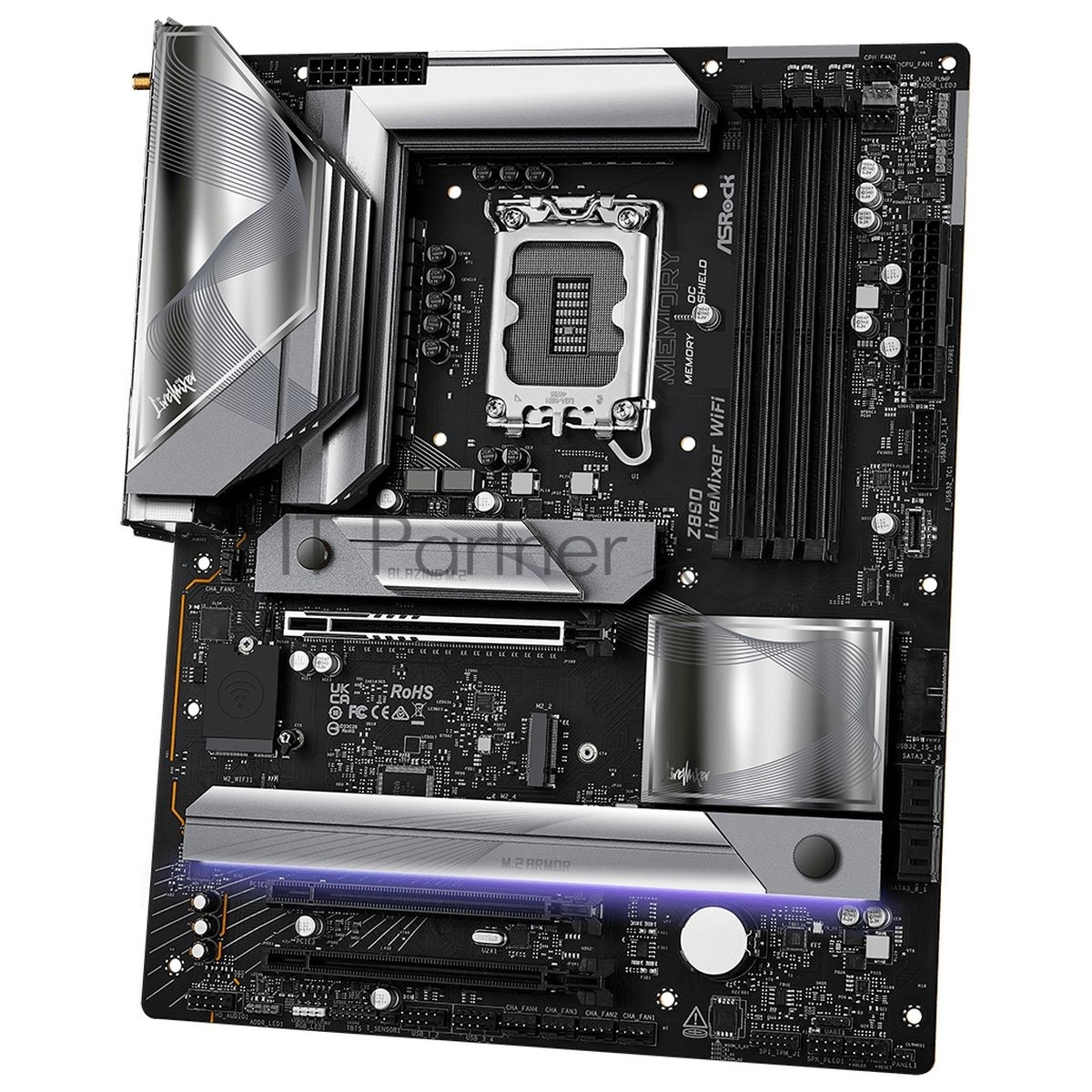 Z890 LiveMixer WiFi, LGA 1851, Intel Z890, 4xDDR5, 4xSATA, 4xM.2, 1xPCIe 5.0 x16, 2xPCIe 4.0 x16, 2xUSB-C Thunderbolt 4, 10xUSB-A 3.2 Gen 1, 2xUSB-A 3.2 Gen 2, 1xHDMI, 1x2.5Gb LAN, 5x3.5 мм, 7.1, ATX