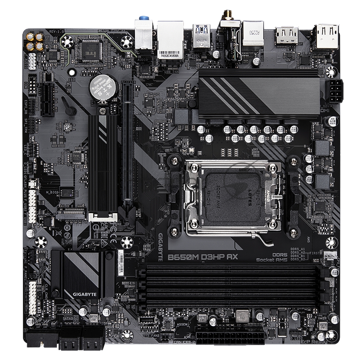 B650M D3HP AX, AM5, AMD B650, 4xDDR5, 4xSATA, 2xM.2, 1xPCI-E 4.0 x16, 1xPCI-E 4.0 x1, 3xUSB-A 3.2 Gen 1, 1xUSB-C 3.2 Gen 2, 1x 2.5Gb LAN, 3x3.5 мм, 7.1, Micro-ATX