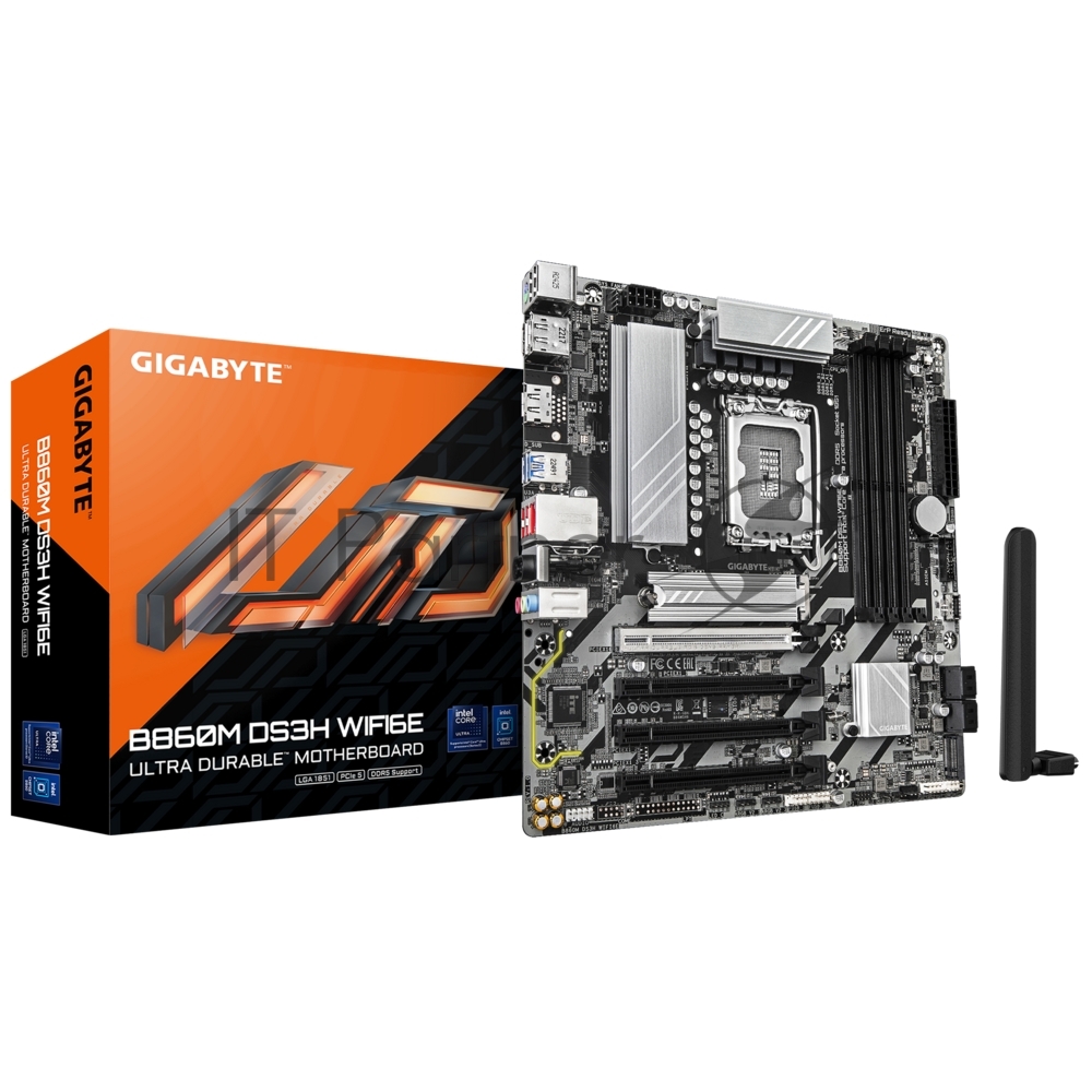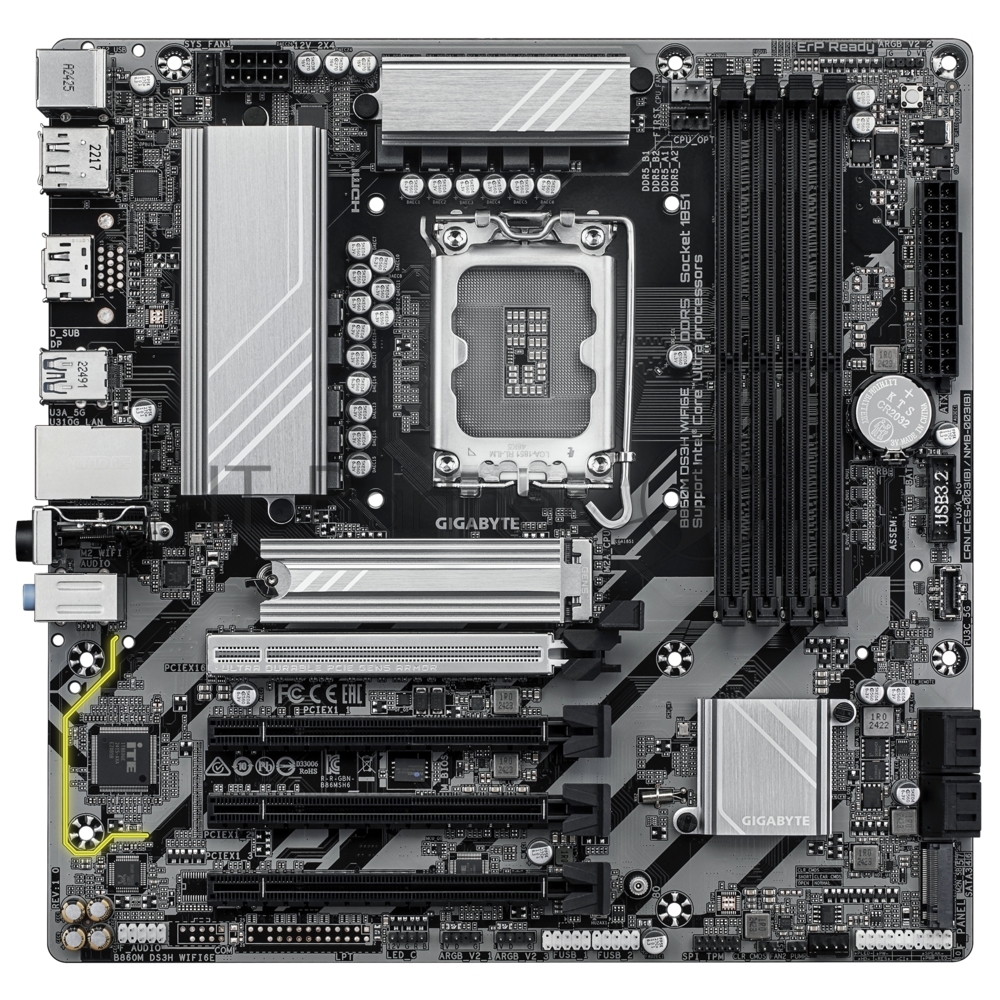 B860M DS3H WIFI6E, LGA1851, Intel B860, 4xDDR5, 4xSATA, 2xM.2, 1xPCIe 5.0 x16, 3xPCIe 4.0 x1, 2xDP, 1xHDMI, 1x2.5Gb LAN, Wi-Fi 6E, Bluetooth 5.3, 1xUSB-C 10Gbps, 2xUSB-A 10Gbps, 4xUSB-A 5Gbps, 7xUSB-A 2.0, 3x3.5 мм, 7.1, mATX