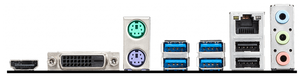 - Разъемы на задней панели: DVI, HDMI, LAN RJ-45, PS/2 (клавиатура/мышь), USB 3.2 Gen1 Type-A x 4