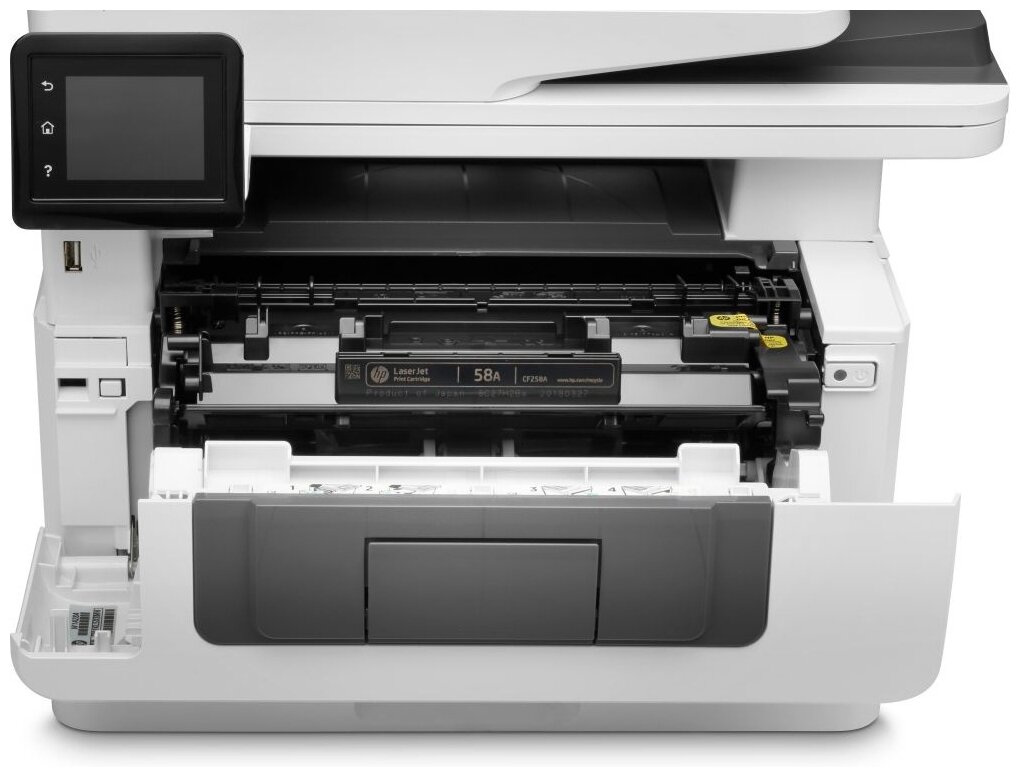 тип устройства: МФУ, цветность печати: черно-белая, технология печати: лазерная, максимальный формат: A4, интерфейсы: Wi-Fi, Ethernet (RJ-45), USB, Bluetooth, AirPrint, Скорость ч/б печати (A4): 30-39 стр/мин, количество страниц в месяц: 80000, функции печати: автоматическая двусторонняя печать, функции сканера/копира: сканирование, отправка изображения по e-mail, копирование