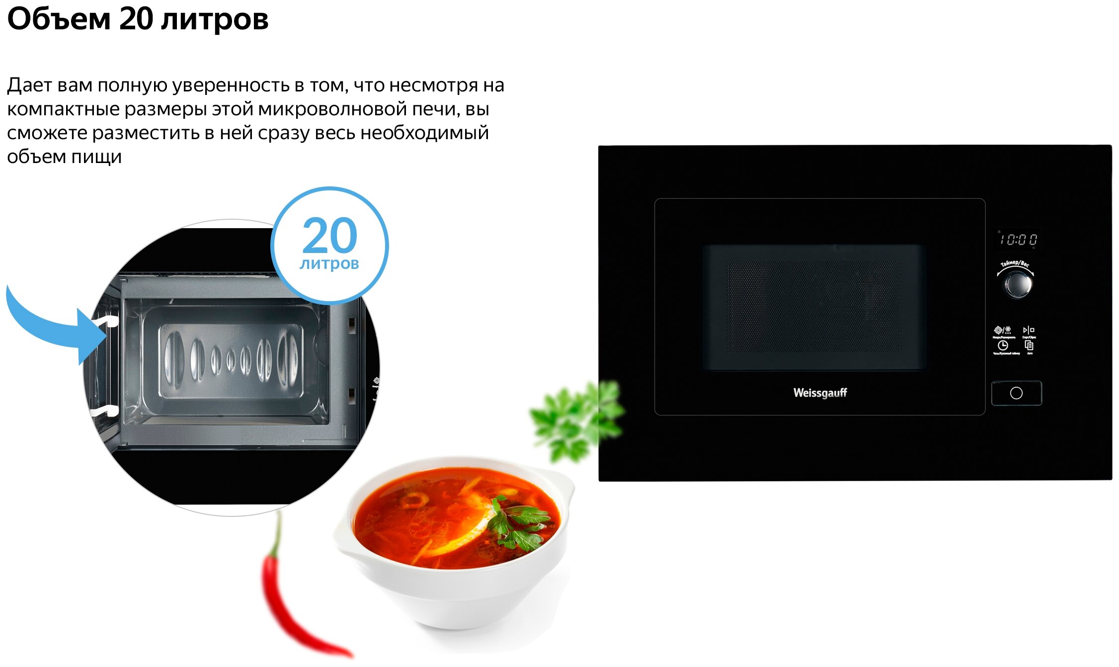 соло (без гриля и конвекции), объем 20 л, мощность микроволн 700 Вт, автоматические режимы: разморозка, приготовление, система равномерного распределения микроволн, размеры (ШxВxГ): 59.4x39x29.3 cм, цвет корпуса: черный