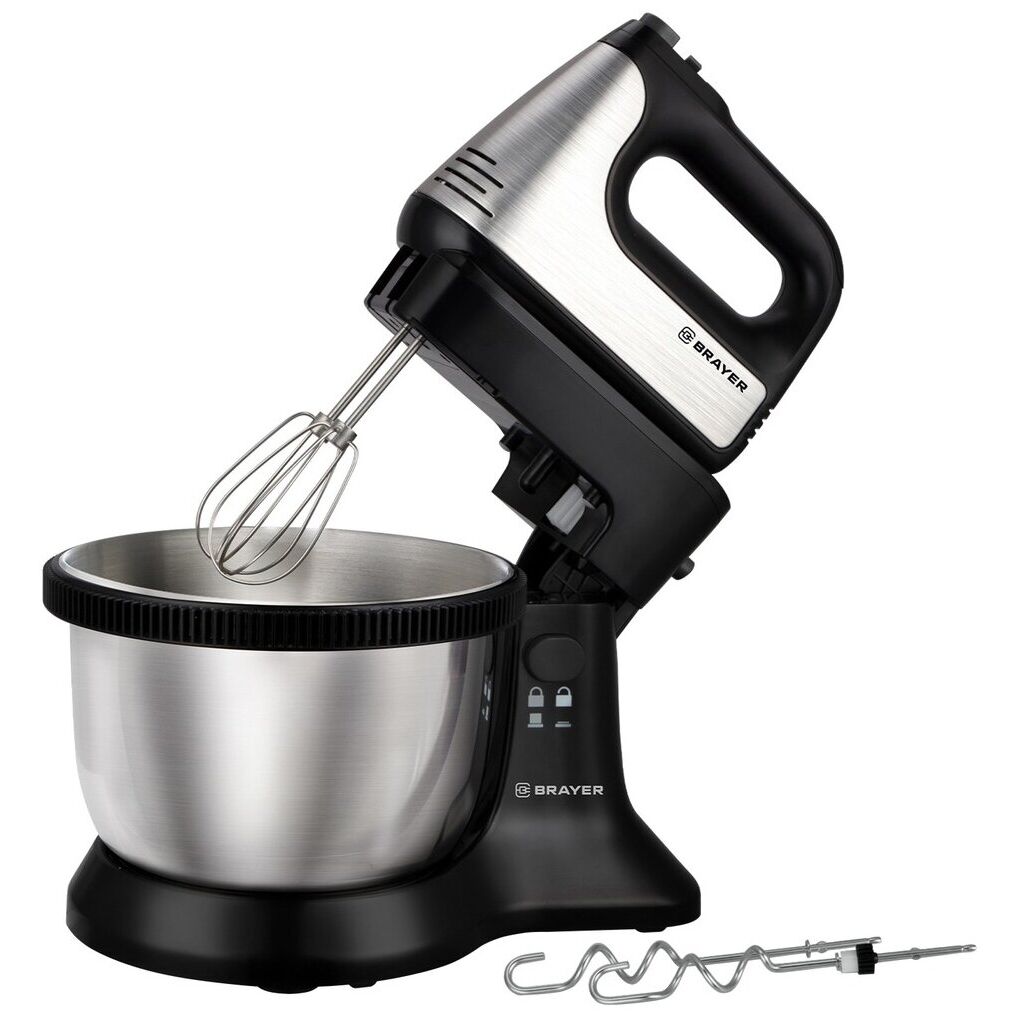 Тип ; стационарный; Чаша; 3.40 л, нерж.сталь; Мощность; 500 Вт; Число скоростей; 5; Дополнительные режимы; турбо; Насадки; крючки для замешивания теста, венчик для взбивания; Количество насадок; 4; Материал корпуса; металл/пластик; Кнопка отсоединения насадок; есть