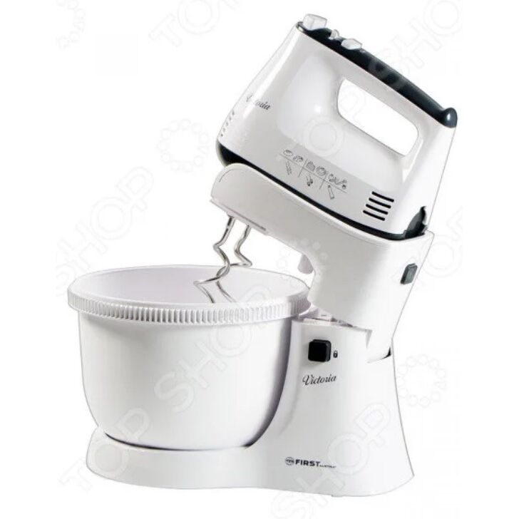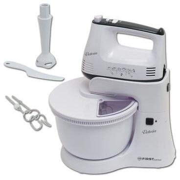 Тип : стационарный; Чаша: 3,5 л; Мощность: 300 Вт; Число скоростей: 5 скоростных режимов; Дополнительные режимы: функция турбо; Насадки: съемный блендер, 2 пары насадок из нержавеющей стали, для замешивания теста и взбивания продуктов, брызговик; Автоматическое вращение чаши: есть