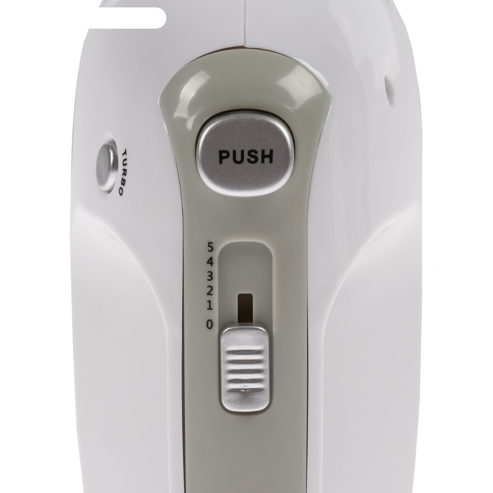 Общие Характеристики: ; Тип ; ручной; Мощность; 250 Вт; Число скоростей; 5; Дополнительные режимы; турбо; Насадки; крючки для замешивания теста, венчик для взбивания; Количество насадок; 4; Материал корпуса; пластик; Особенности; Кнопка отсоединения насадок; есть; Вес; 0.88 кг