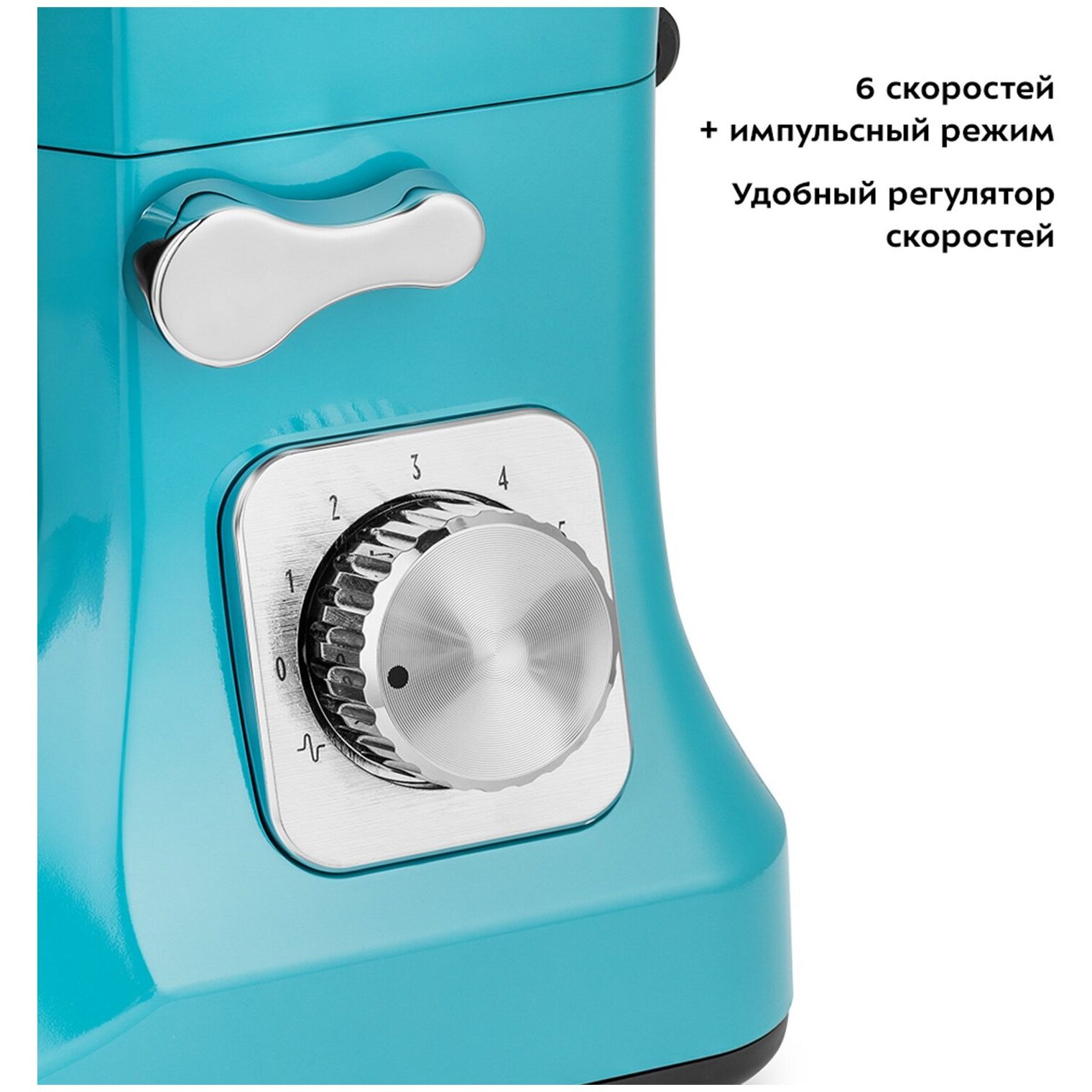 Основные Характеристики: ; Цвет товара темно-бирюзовый; Тип планетарный стационарный; Мощность 1400 Вт; Число скоростей 6; Дополнительные режимы импульсный режим; Количество насадок 4; Материал корпуса пластик; Материал чаши нержавеющая сталь; Объем чаши 5.7 л; Насадки; венчик для взбивания, крючки для замешивания теста, насадка для приготовления пюре; Длина сетевого шнура 1.2 м; Вес 4.24 кг; Дополнительная информация; Плавное изменение скорости, Отключение при перегреве, Таймер выключения, Индикация выбранной мощности