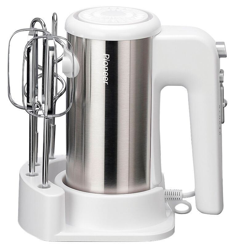 Максимальная мощность, Вт.: 300 ; Количество скоростей: 5 ; Турборежим: есть ; Комплектация: миксер, венчики для взбивания, крючки для замеса теста, подставка для хранения, гарантийный талон, инструкция на русском языке ; Цвет: белый с серебристым ; Электропитание, в., Гц.: 220-240, 50 ; Особенности: эффективная система охлаждения