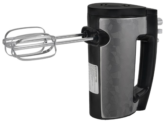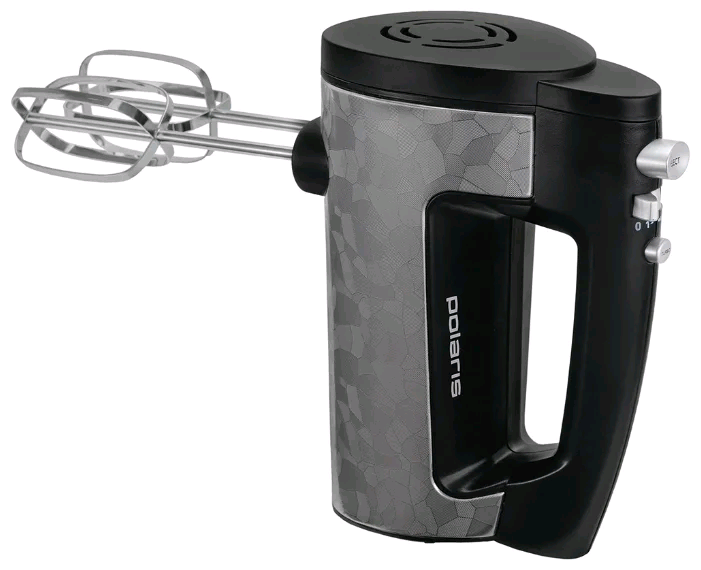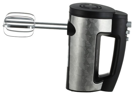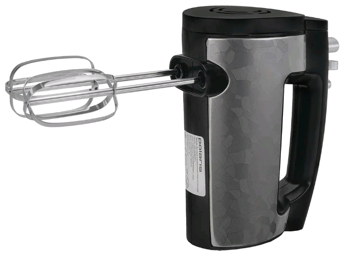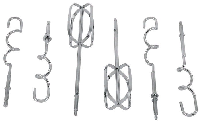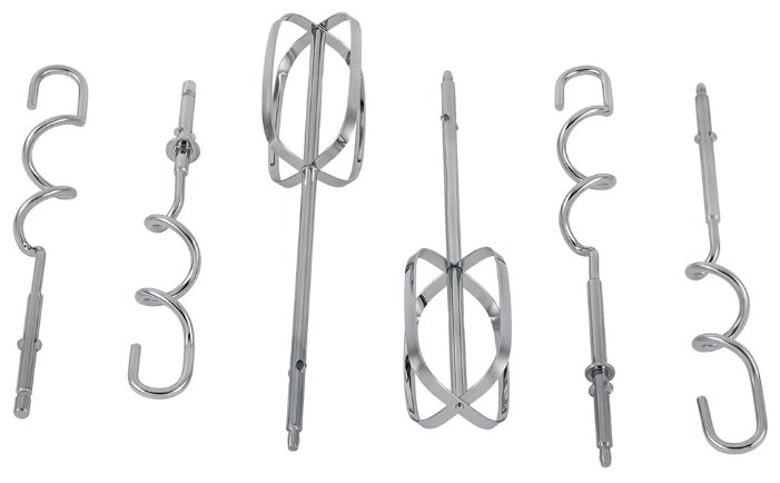 ручной миксер; мощность 500 Вт; крючки для замешивания теста, венчик для взбивания; кнопка отсоединения насадок