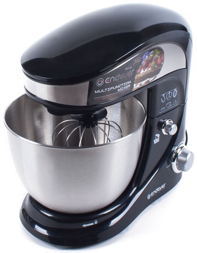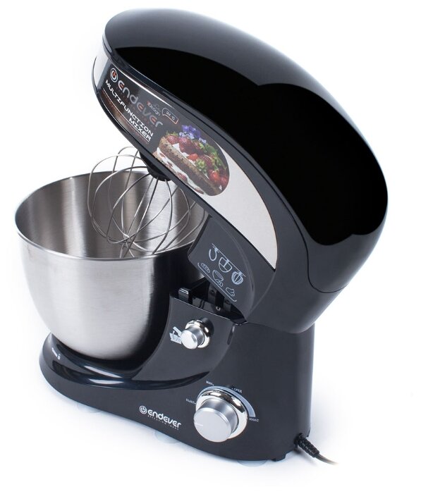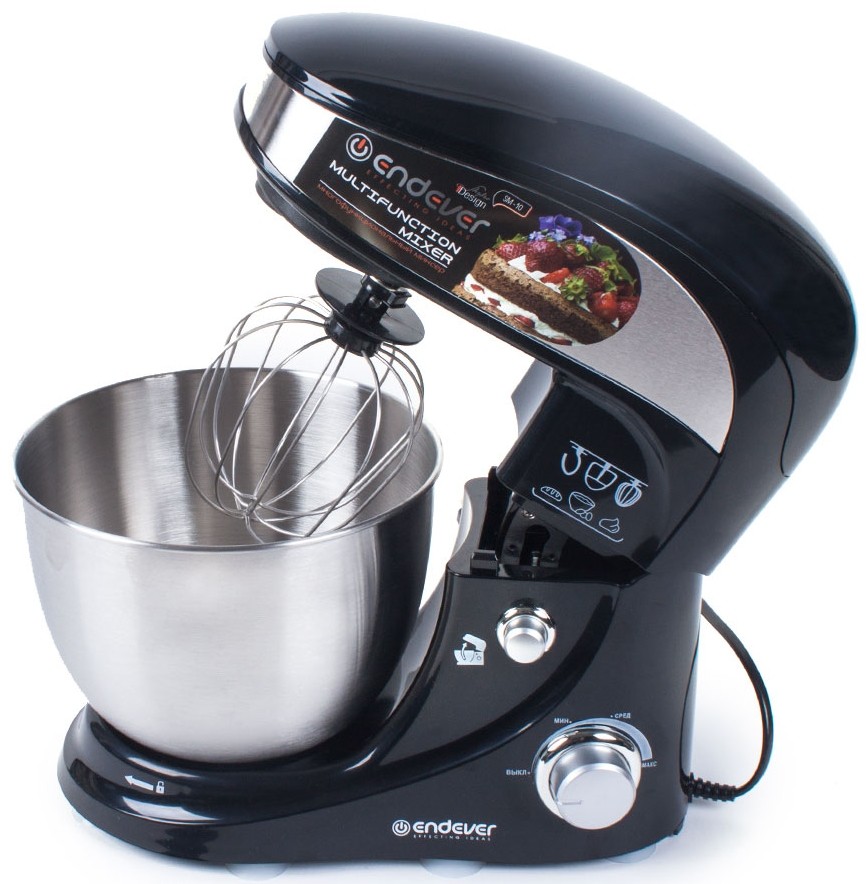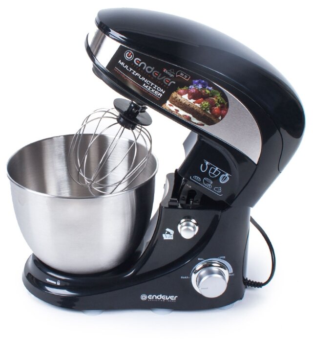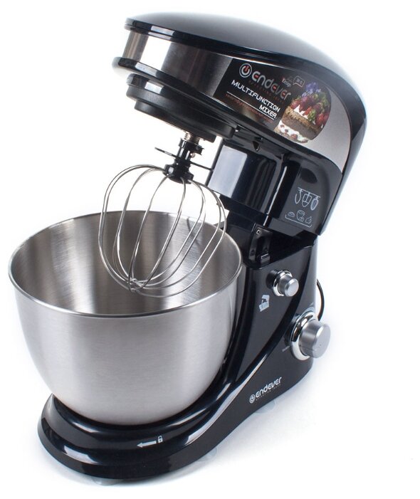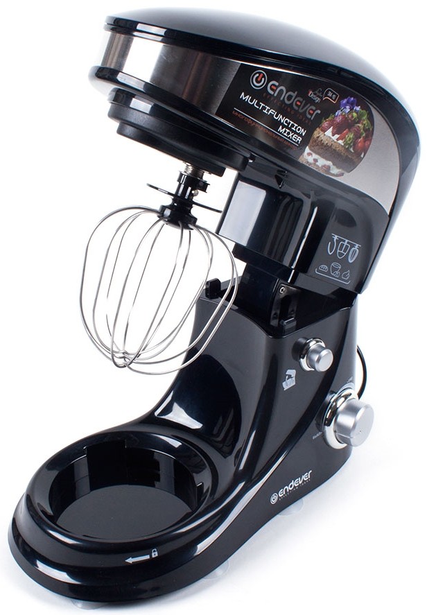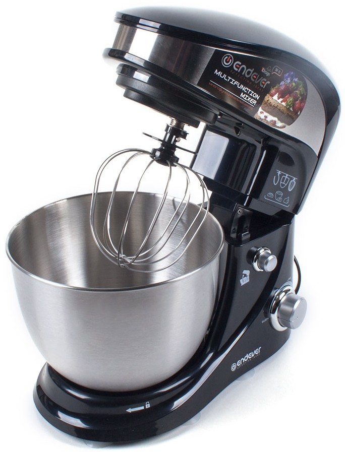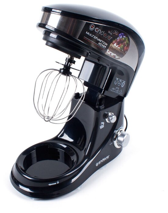стационарный миксер; планетарное движение венчика; мощность 600 Вт; крючки для замешивания теста, венчик для взбивания