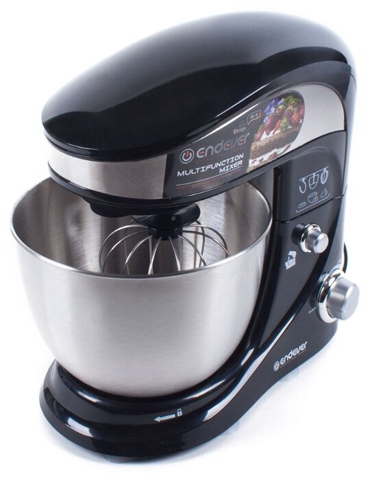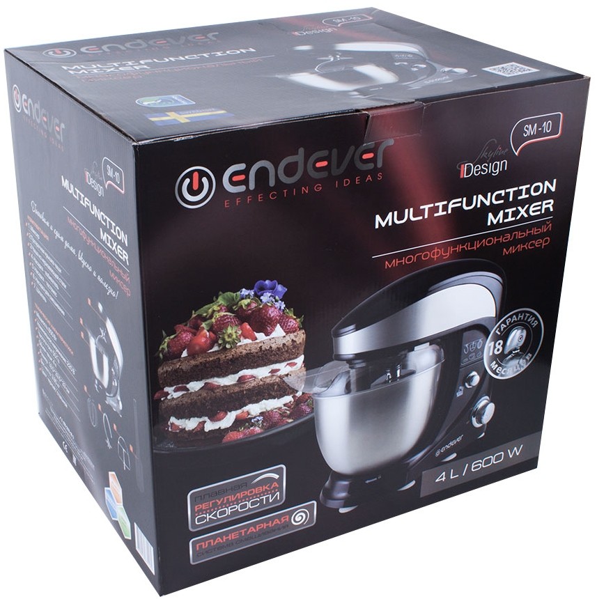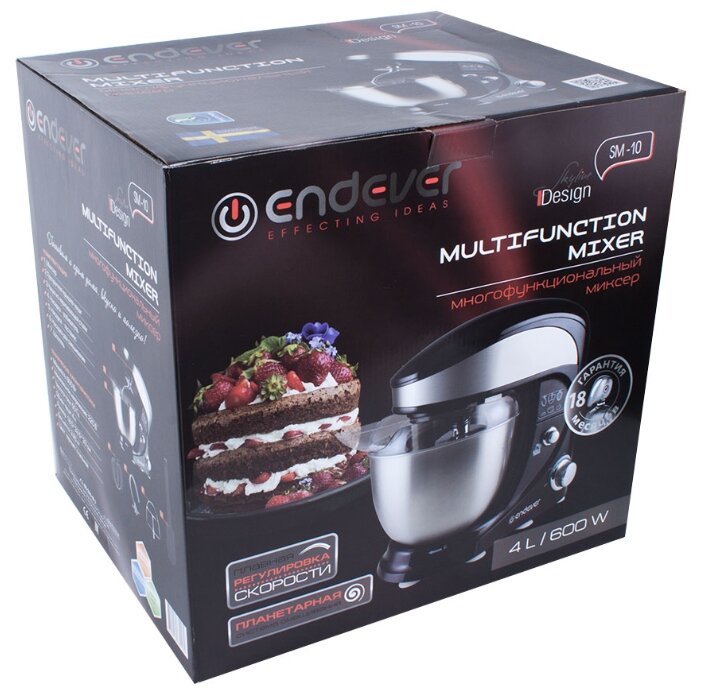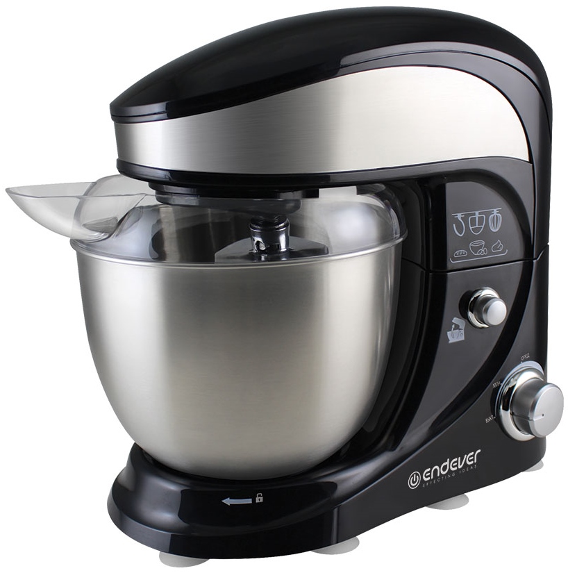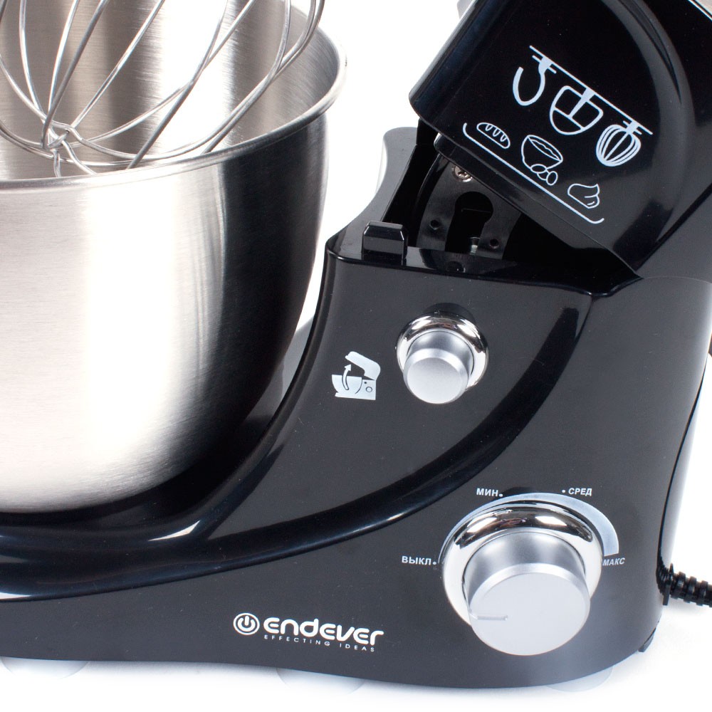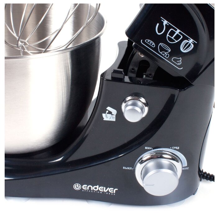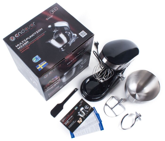 стационарный миксер; планетарное движение венчика; мощность 600 Вт; крючки для замешивания теста, венчик для взбивания