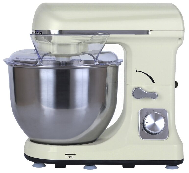 стационарный миксер; планетарное движение венчика; мощность 1000 Вт; крючки для замешивания теста, венчик для взбивания; вес 4.3 кг