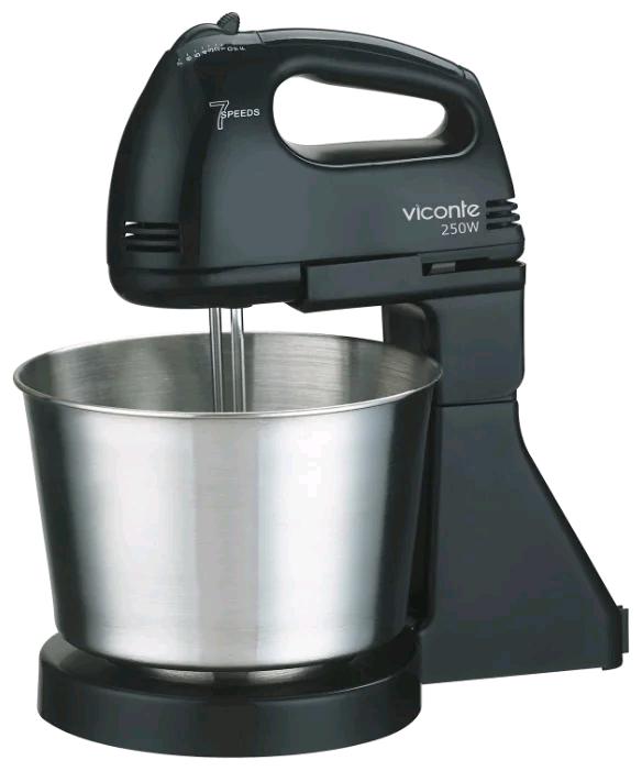 стационарный миксер; мощность 250 Вт; крючки для замешивания теста, венчик для взбивания