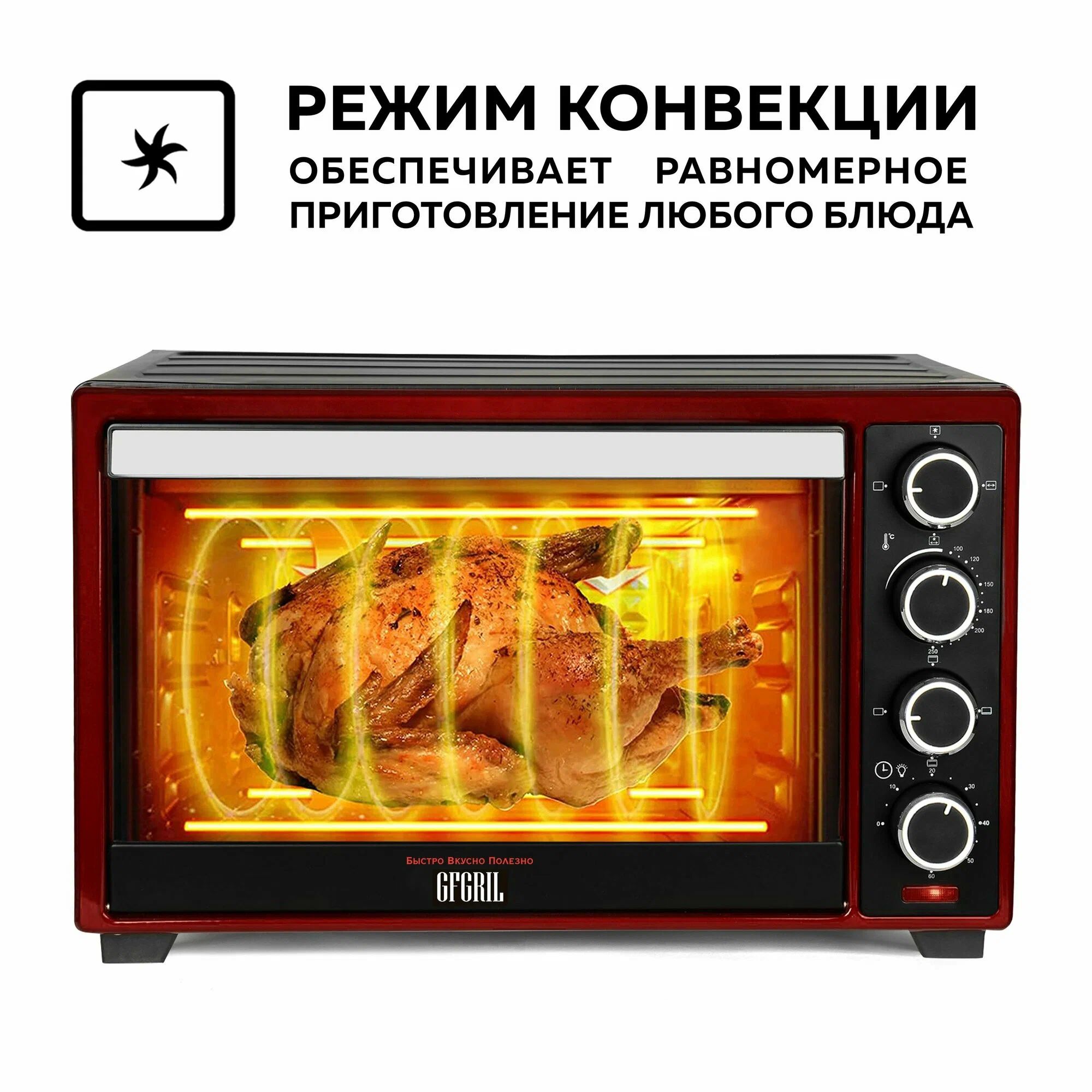 Технические характеристики мини-печи GFGRIL GFO-48BR Max мощность 2000 Вт Напряжение 220 В Объем камеры 48 л Степень защиты автовыключение Max температура 250 Рабочая температура от +100 до +250 Количество режимов нагрева 6 (верхний гриль, верхний нагрев, нижний нагрев, размораживание, конвекция, верхний + нижний нагрев) Таймер да Наличие конфорок нет Вес нетто 9.4 кг Габариты без упаковки 610x435x410 мм