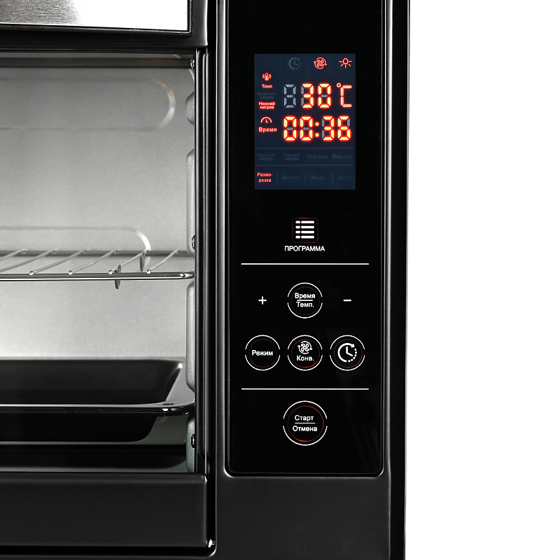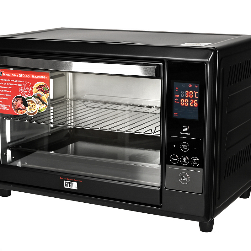 Многофункциональная печь GFOO-5 (объем 38 л) отличается удобным электронным управлением с возможностью выбора одной из 4х предустановленных программ: Мясо: Рыба: Выпечка: Разморозка: Конвекция в сочетании с различными режимами работы (Вертел/Верхний нагрев/Нижний нагрев/Нагрев), а также широкий набор аксессуаров, входящих в комплект – противень, решетка-гриль, вертел, шашлычница, камень для пиццы и антипригарный коврик – дают простор для воплощения любых кулинарных фантазий.: Предустановленные температуру и время в каждом режиме можно корректировать вручную – температура регулируется от 25 до 230С, а время – от 1 мин до 10 часов. : Функция «Отложенный старт» дает возможность получить свежеприготовленное блюдо к установленному времени. : Высокая мощность 2 000 Вт. : Благодаря оптимальным размерам мини-печь экономит место и удобна при транспортировке. Она идеально подойдет для маленькой кухни, дачи, квартиры-студии, автодома или офисного помещения. Внутренняя камера мини-печи имеет поверхность легкой чистки, а