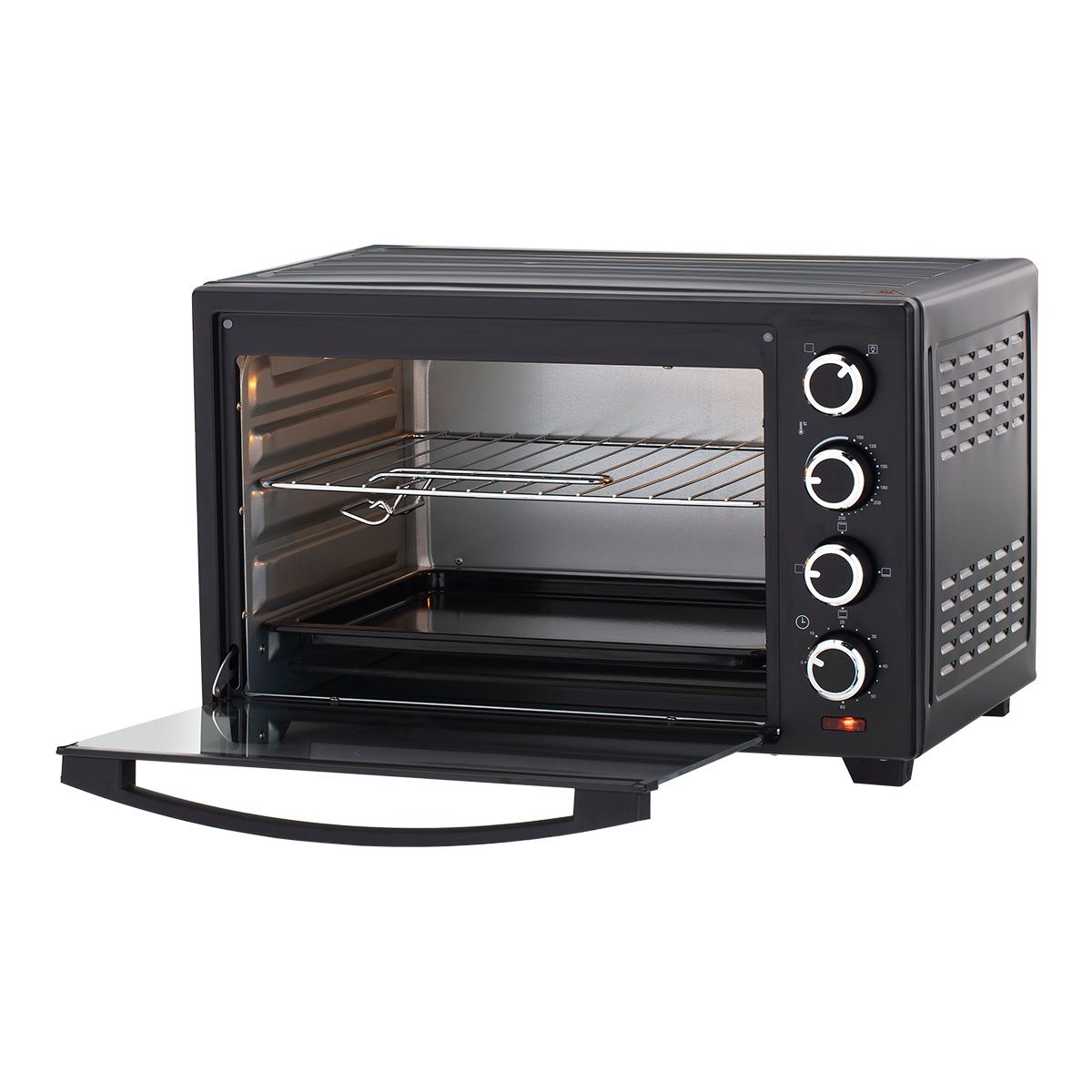 Внутренний объем 38 л. ; Потребляемая мощность 1600 Вт ; Тип управления механический ; Открытие дверцы вниз ; Термостат да ; Максимальная температура 250°С ; Тип гриля ТЭН ; Таймер до 60 мин. ; Стекло дверцы духовки 1-слойное ; Индикация включения да ; Индикация заданной температуры да ; Индикация режима работы да ; Подсветка камеры да ; Количество режимов работы 3 ; Кабель ; Длина сетевого шнура 0,9 м. ; Корпус ; Цвет черный ; Размеры (ШхВхГ) 533x391x350 мм. ; Размеры упаковки (ШхВхГ) 573x426x386 мм. ; Вес нетто 7.1 кг. ; Вес брутто 8.2 кг. ; Внутреннее покрытие камеры оцинкованная сталь