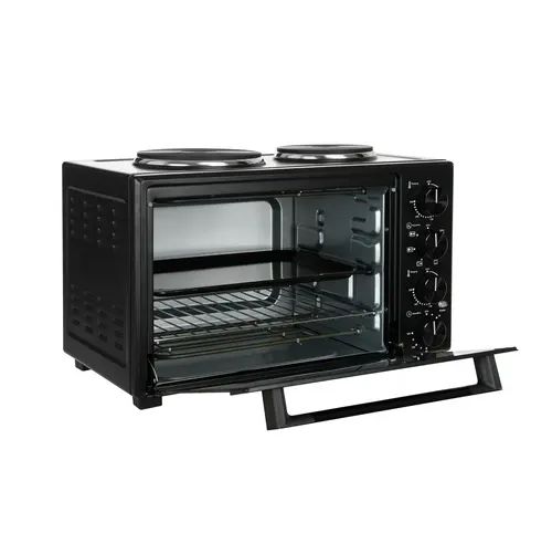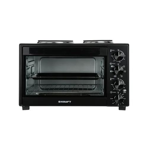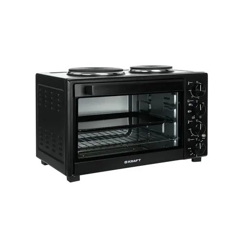 Общие параметры: Тип: мини-печь: Модель: Kraft KFC-MOHP 380 HBL: Основной цвет: черный: Духовка: Тип духовки: электрическая: Внутренний объем духовки : 38 л: Материал корпуса: металл: Термоизолированный корпус : нет: Ручка с защитой от нагревания : есть: Минимальная температура : 70 °C: Максимальная температура : 250 °C: Количество режимов работы: 6 шт: Режимы приготовления: верхний, верхний + нижний, левая конфорка, левая конфорка + правая конфорка, нижний, правая конфорка: Конвекция : нет: Гриль : нет: Вертел : нет: Количество нагревательных элементов: 4 шт: Максимальное время приготовления: 120 мин: Открытие дверцы духовки : откидная: Количество стекол дверцы: 1 шт: Подсветка камеры : нет: Вид направляющих: рельефные: Конфорки: Общее количество конфорок : 2 шт: Число электрических конфорок: 2: Число газовых конфорок: нет: Материал конфорок: чугун: Крышка : нет: Управление: Тип управления : механическое: Управление со смартфона: нет: Приложение для управления: нет: Голосовой помощник : нет: Таймер обратного