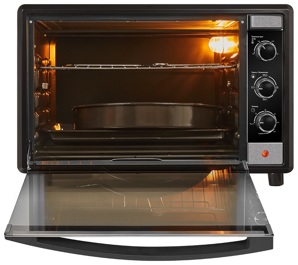 режимы: верхний нагрев, верхний+нижний нагрев, конвекция, нижний нагрев, объём камеры: 45 л, особенности: внутренняя подсветка, механическое управление, таймер, управление: механическое, комплектация: круглый противень, поддон для сбора крошек, противень, решётка, ухват, максимальная потребляемая мощность: 2000 Вт, ширина: 54.90 см, глубина: 40.80 см, высота: 37.70 см, тип: мини-печь