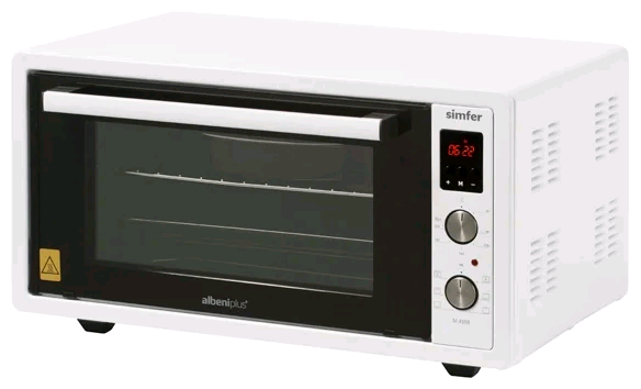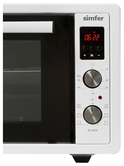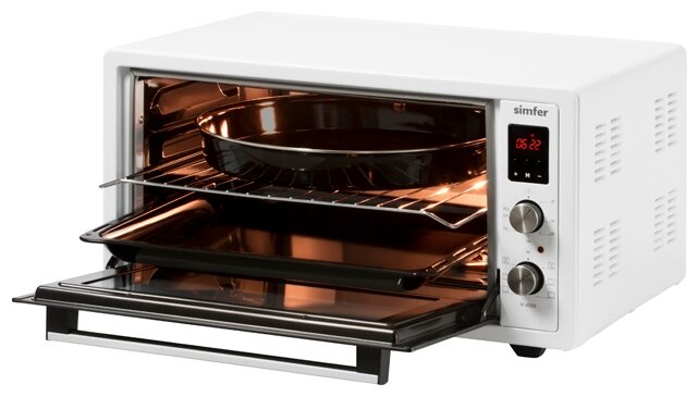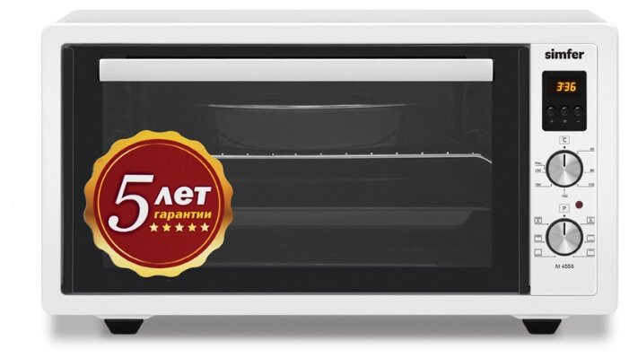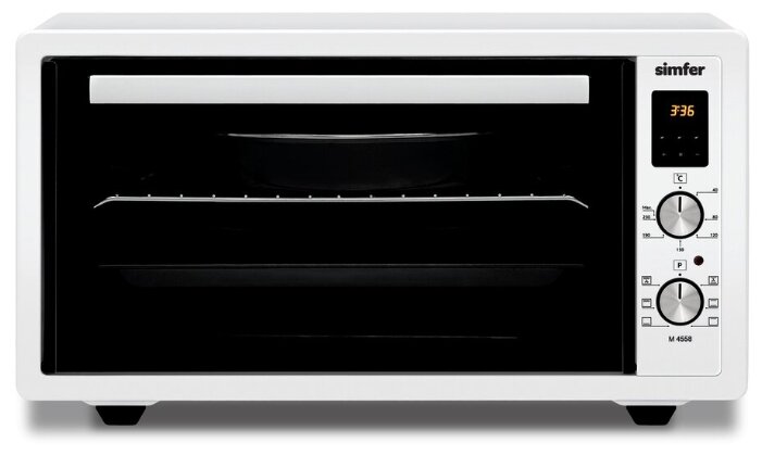 объём камеры 45 л; режимы: верхний гриль, верхний нагрев, нижний нагрев, конвекция, верхний+нижний нагрев; максимальная температура нагрева: 250 °C; электронный таймер; внутренняя подсветка, механическое управление, дисплей