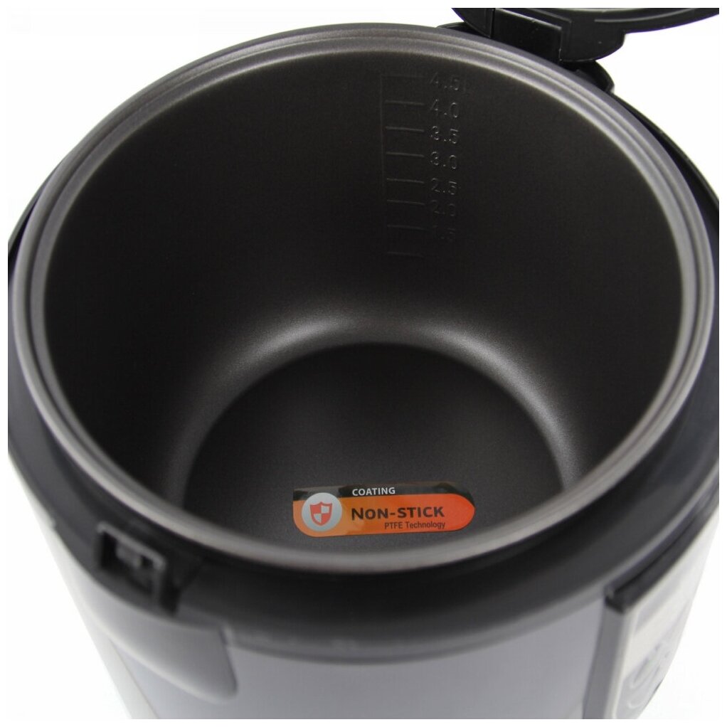 чаша: 5 л; программы: мультиповар, молочная каша, жарка, приготовление на пару, выпечка, тушение, плов, йогурт, тесто, крупа; особенности: отложеный старт, поддержание тепла, регулировка времени приготовления; мощность: 860 Вт; управление: электронное