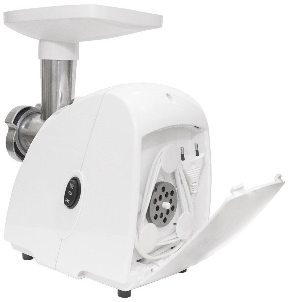 мощность 230 Вт (макс. - 1500 Вт), производительность 1.7 кг/мин, система реверса, насадка для приготовления колбас, насадка для кеббе, диск для фарша