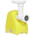 Цвет : желтый: Номинальная мощность 220 Вт: Пиковая мощность 1500 Вт: Производительность 0.4 кг/мин: Насадки в комплекте : Насадки 2 диска для фарша: 3 насадки для нарезки/шинковки: для домашних колбас: для томатов/мягких овощей: для печенья: Общее : Материал корпуса пластик: Материал загрузочного лотка пластик: Реверс есть: Отсек/подставка для хранения насадок есть;
