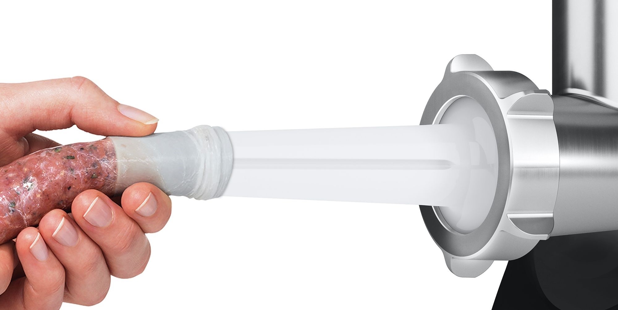 мощность 500 Вт; насадка для приготовления колбас, диск для фарша; корпус из пластика; отсек для хранения насадок