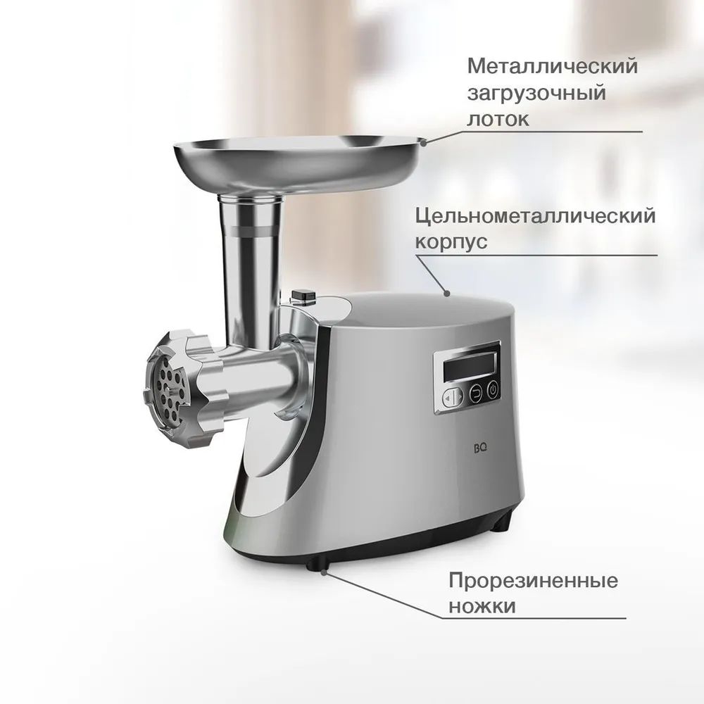 Основные: Производительность, кг/мин: 2: Мощность, Вт: 2100: Количество насадок: 5: Количество скоростей: 1: Реверс: Да: Насадки приборов для измельчения продуктов: Для колбас/сосисок, Для фарша, Кеббе: Системы защиты: Защита от перегрева: Корпус: Материал корпуса: Пластик: Длина шнура, м: 1.1: Материал лотка: Металл: Вес товара, г: 3137: Размеры, мм: 290 x 160 x 200: Общие: Страна-изготовитель: Китай: Тип: Мясорубка: Дополнительные: Бренд: BQ: Цвет: Серебристый, серый металлик;
