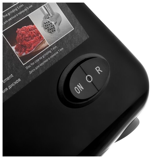 мощность: 600 Вт; производительность: 1.5 кг/мин; система реверса: есть; насадки: диск для фарша; материал корпуса: пластик/металл; особенности: прорезиненные ножки, отсек для хранения насадок