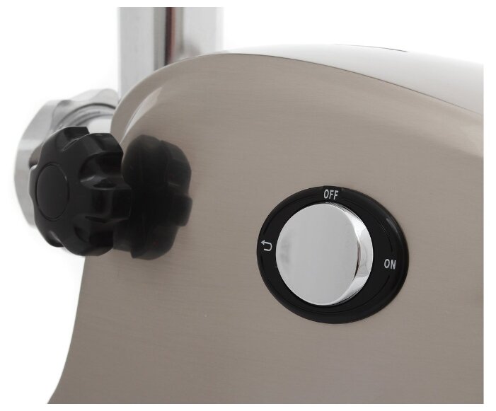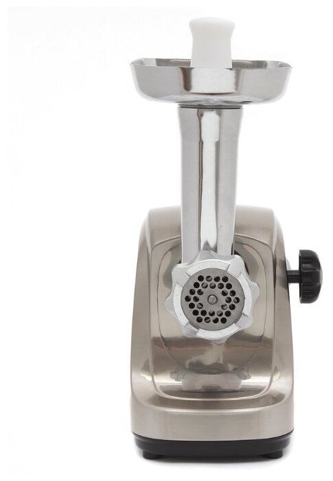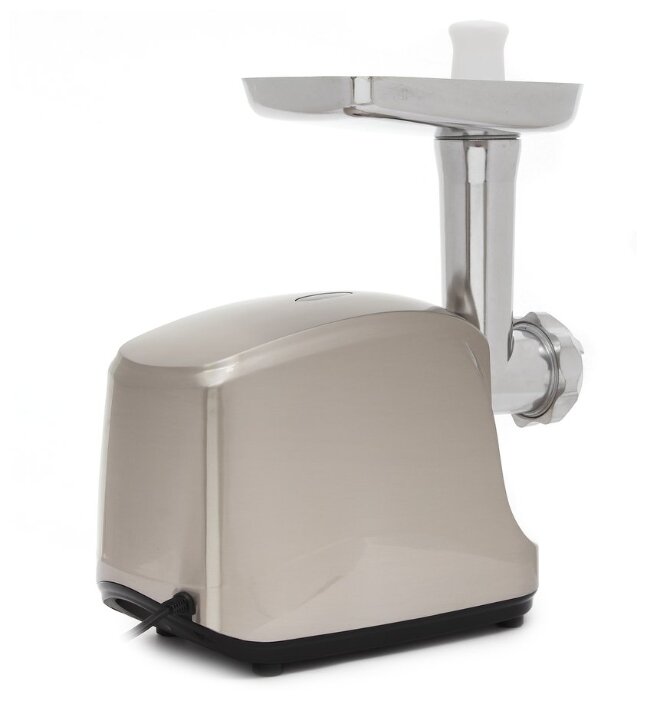 мощность 400 Вт; перерабатывает 2 кг/мин; насадка-терка, насадка для шинковки, насадка для кеббе, диск для фарша; корпус из пластика
